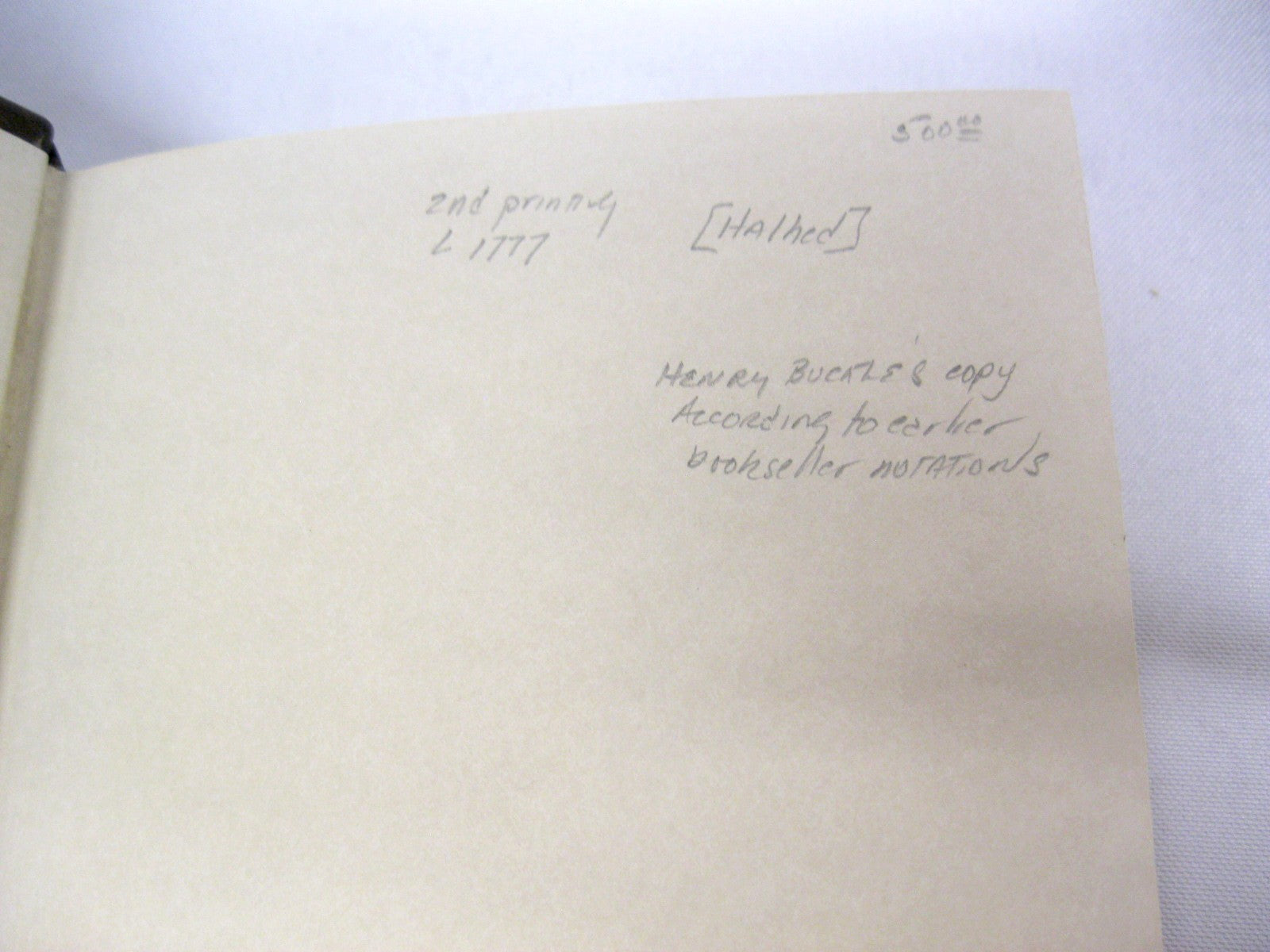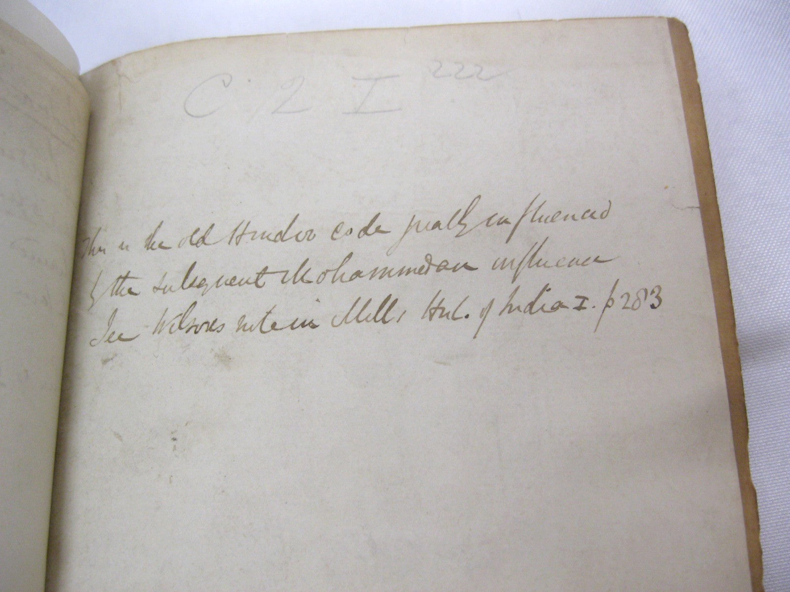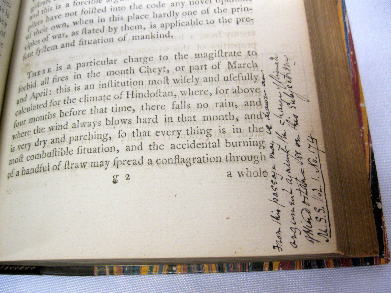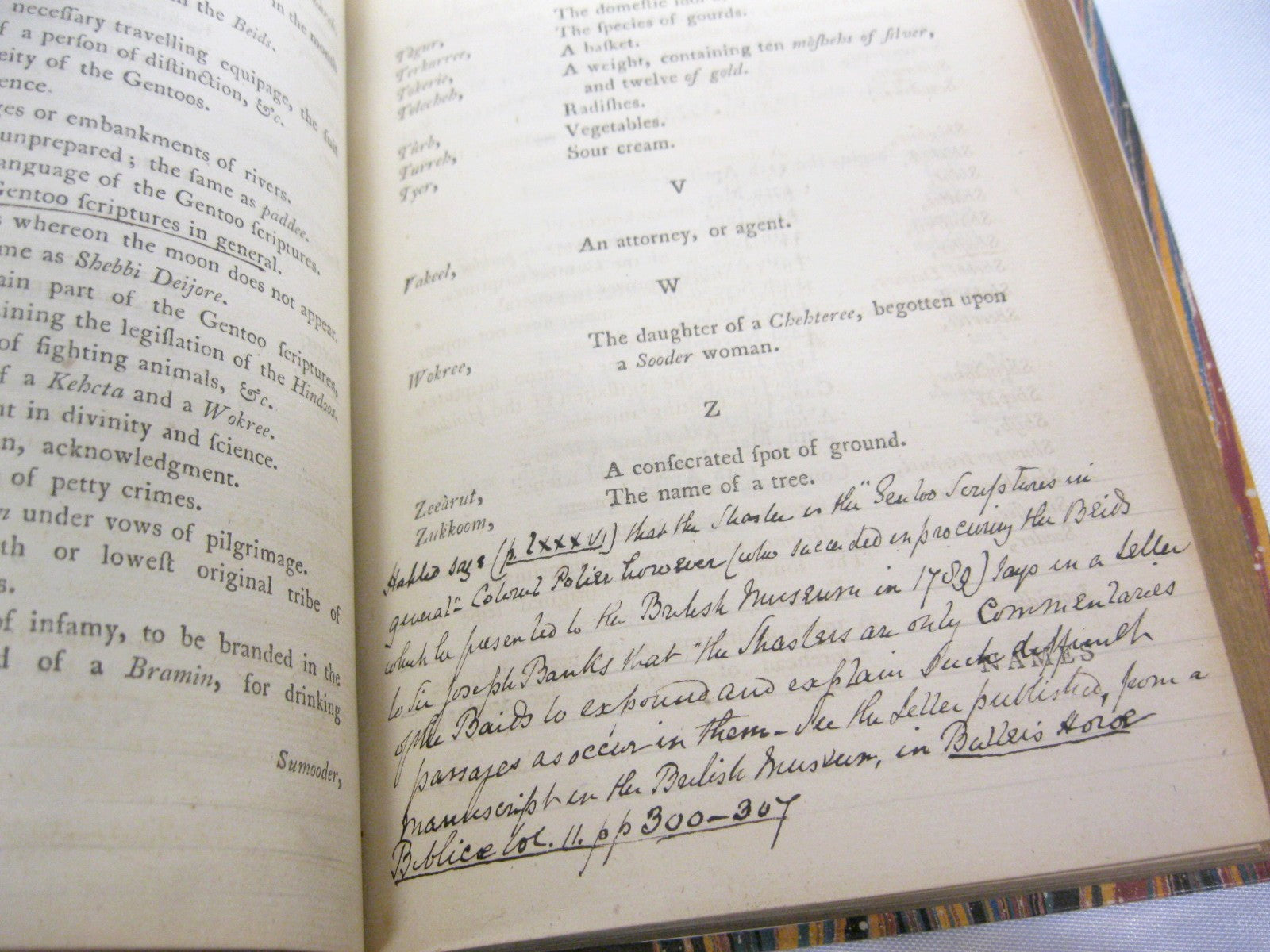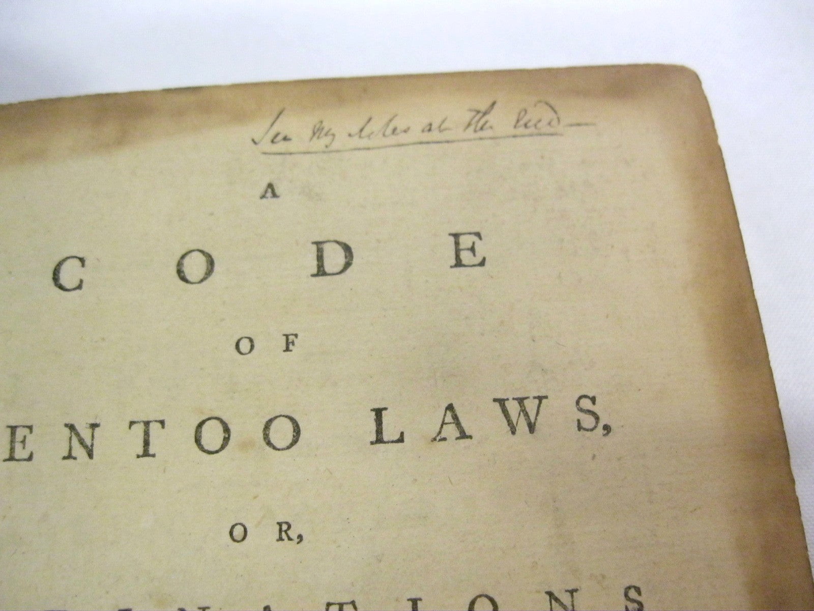 General notes: There is a modern pencil notation in the front that claims the book is "Henry Buckle's copy according to earlier bookseller notations". These notations must have been on a separate slip of paper and are now lost. There are some notes/marginalia scattered throughout the book, and a couple pages of notes bound-in at the front. The subject of the book and the marginalia therein do seem to coincide with the studies of Henry Thomas Buckle, who wrote "A History of Civilization in England" and worked on, but never finished, a broader work on the subject of the history of civilization, for which "A Code of Gentoos" would have served as reference. If this was Buckle, the notes would likely have been made in the 1840s-1850s.