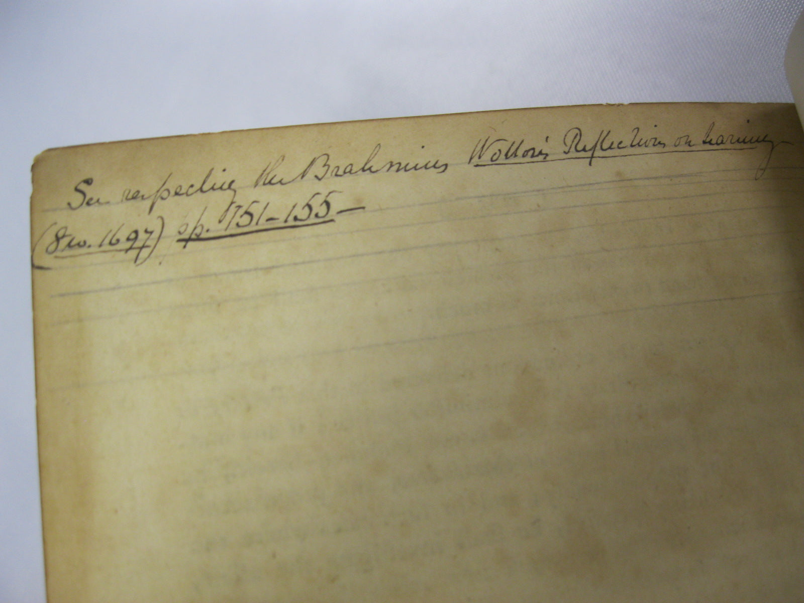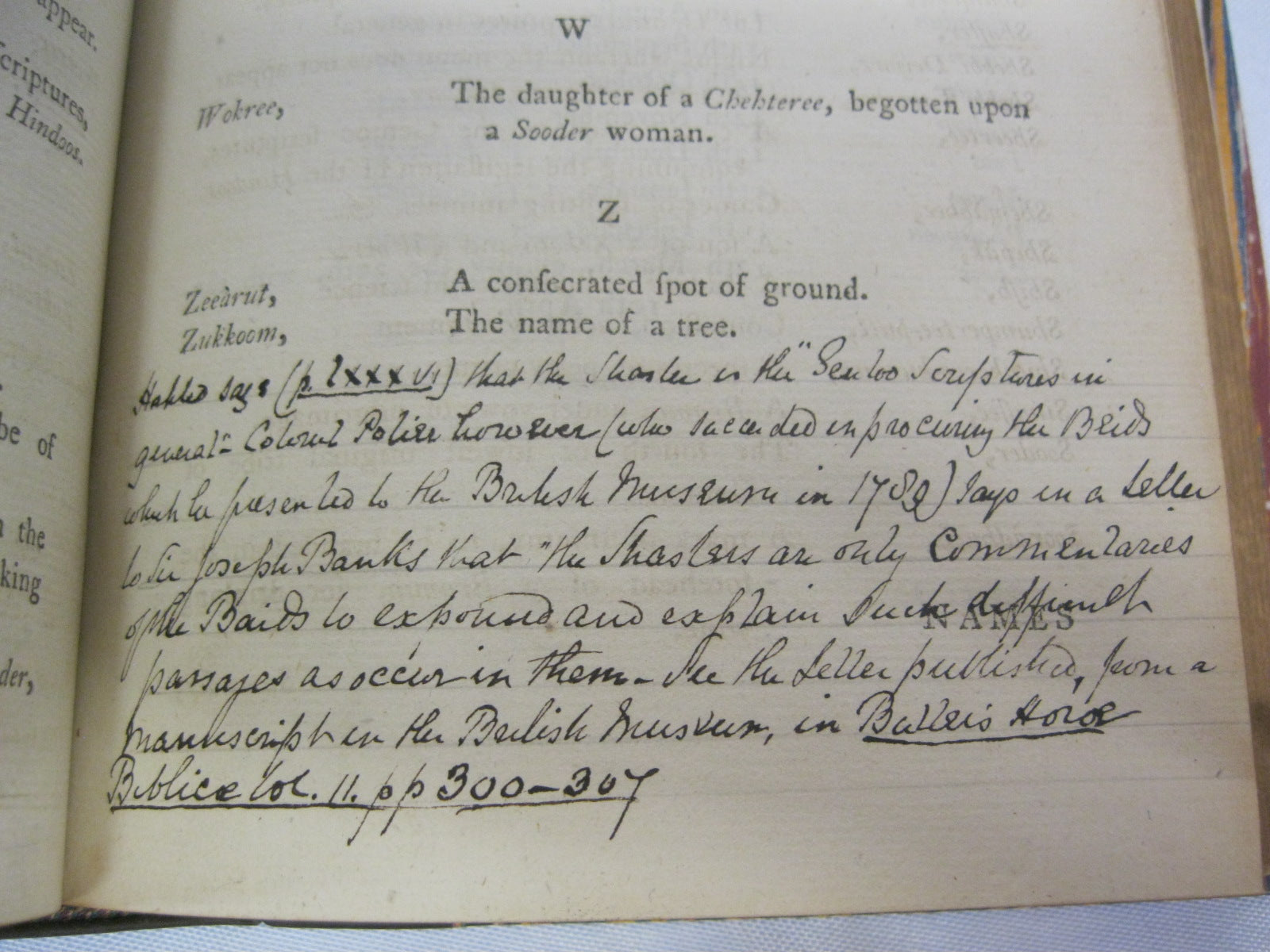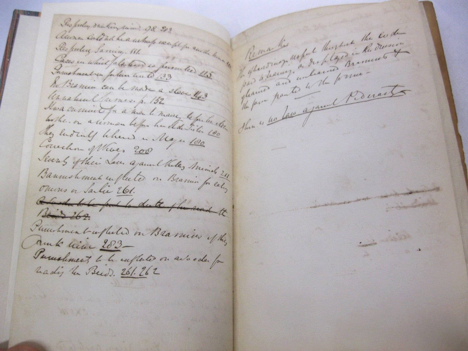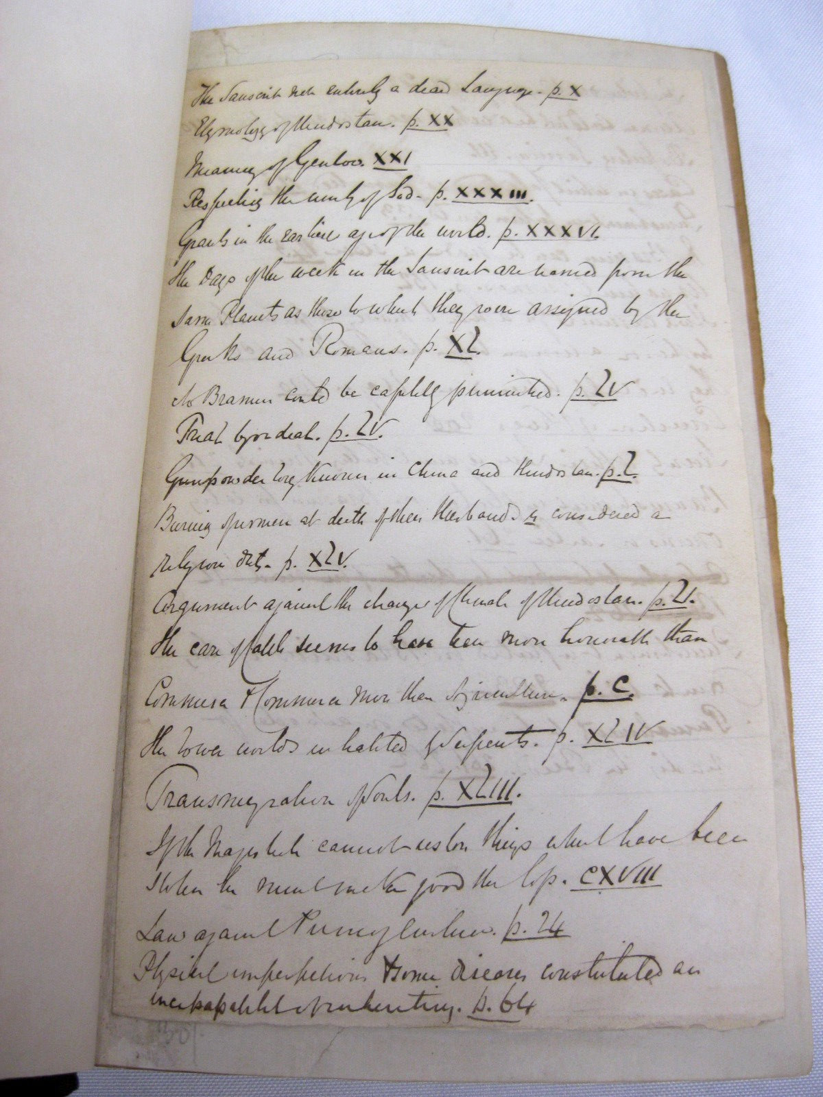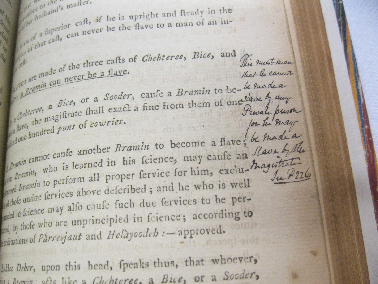 General notes: There is a modern pencil notation in the front that claims the book is "Henry Buckle's copy according to earlier bookseller notations". These notations must have been on a separate slip of paper and are now lost. There are some notes/marginalia scattered throughout the book, and a couple pages of notes bound-in at the front. The subject of the book and the marginalia therein do seem to coincide with the studies of Henry Thomas Buckle, who wrote "A History of Civilization in England" and worked on, but never finished, a broader work on the subject of the history of civilization, for which "A Code of Gentoos" would have served as reference. If this was Buckle, the notes would likely have been made in the 1840s-1850s.