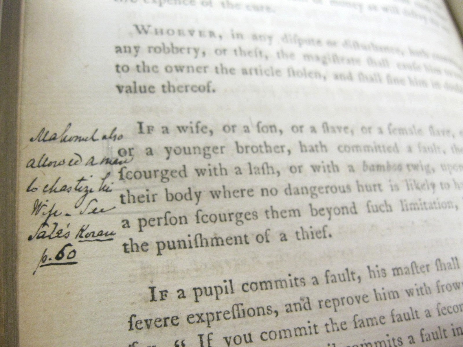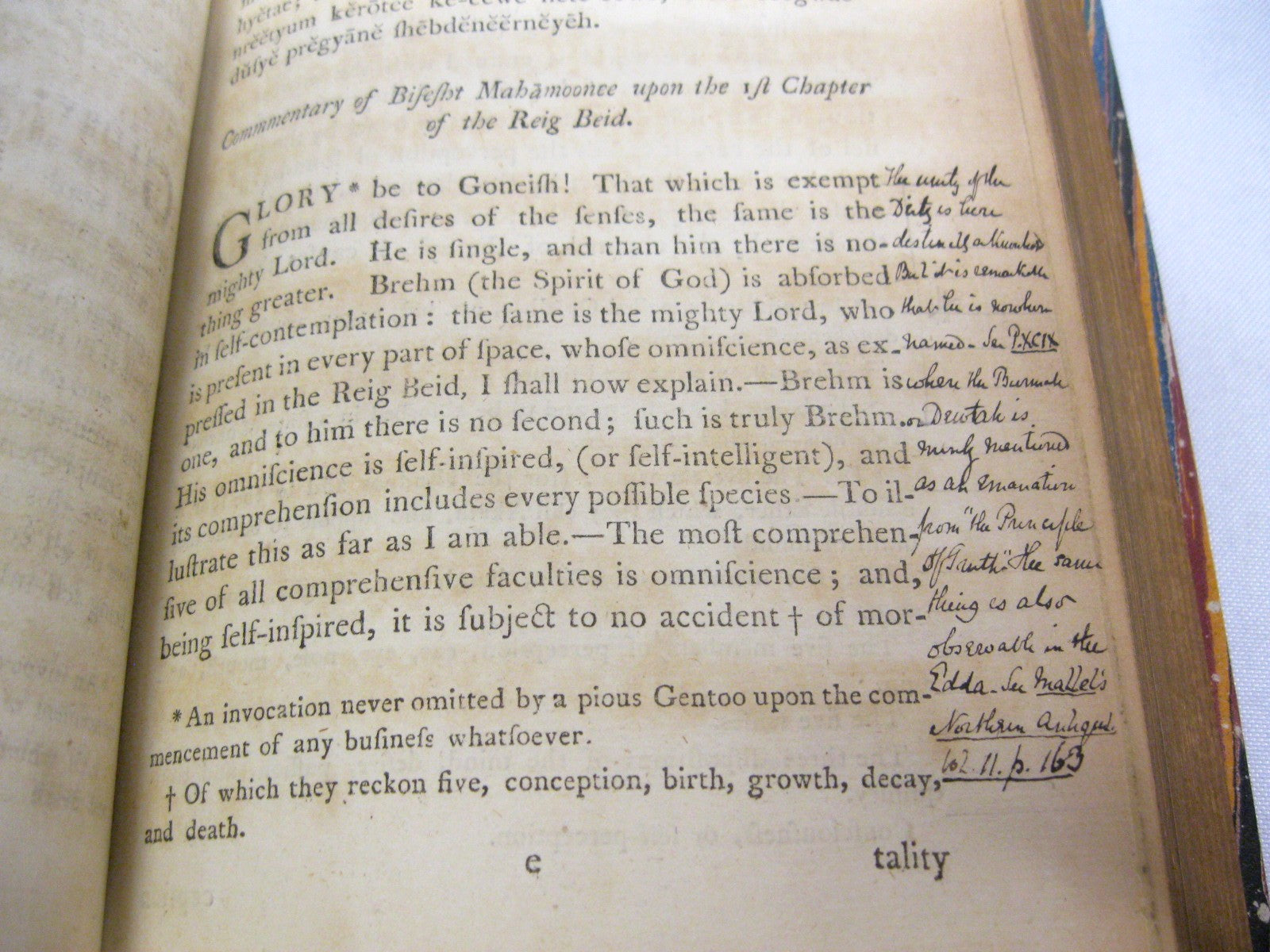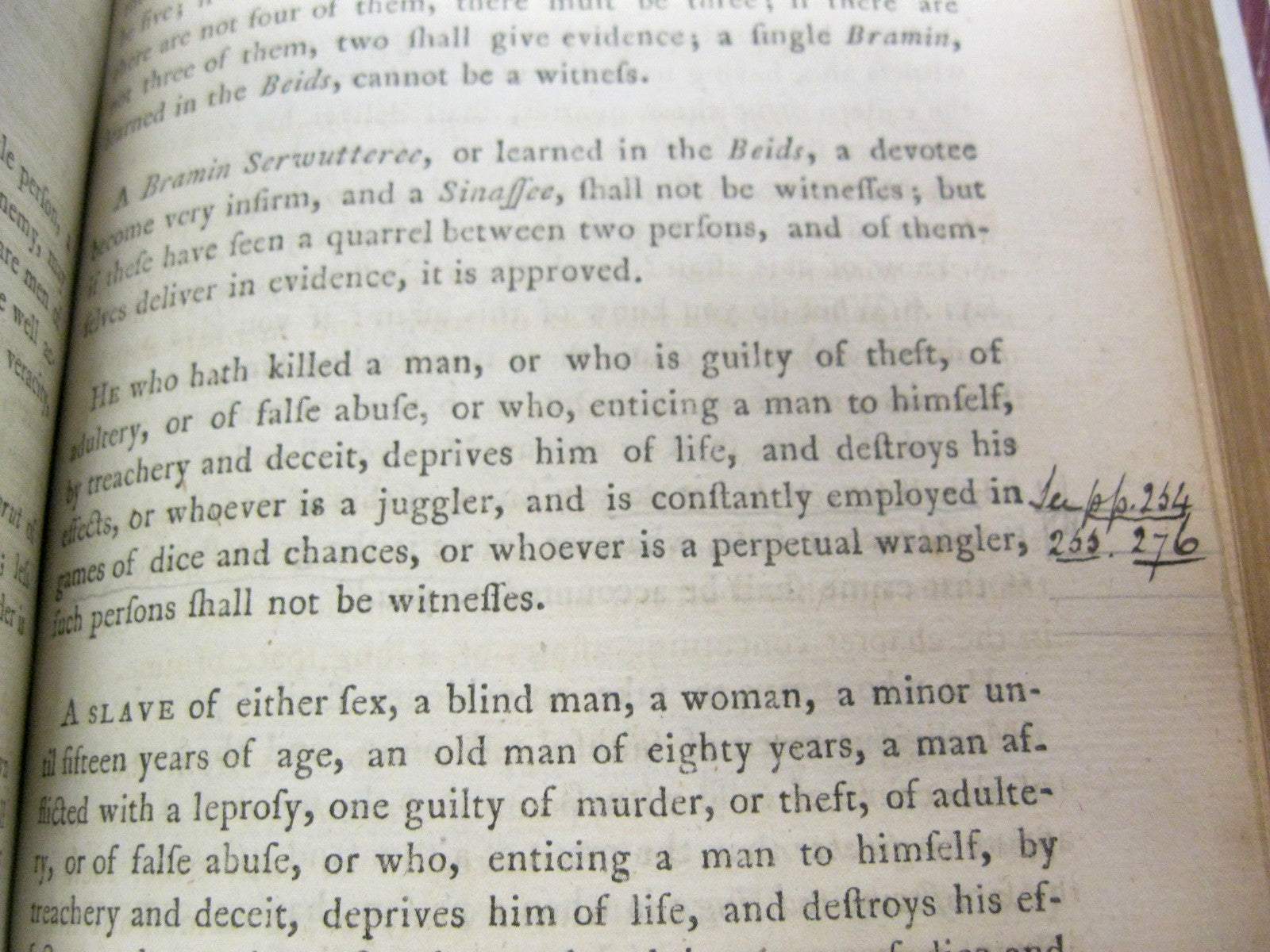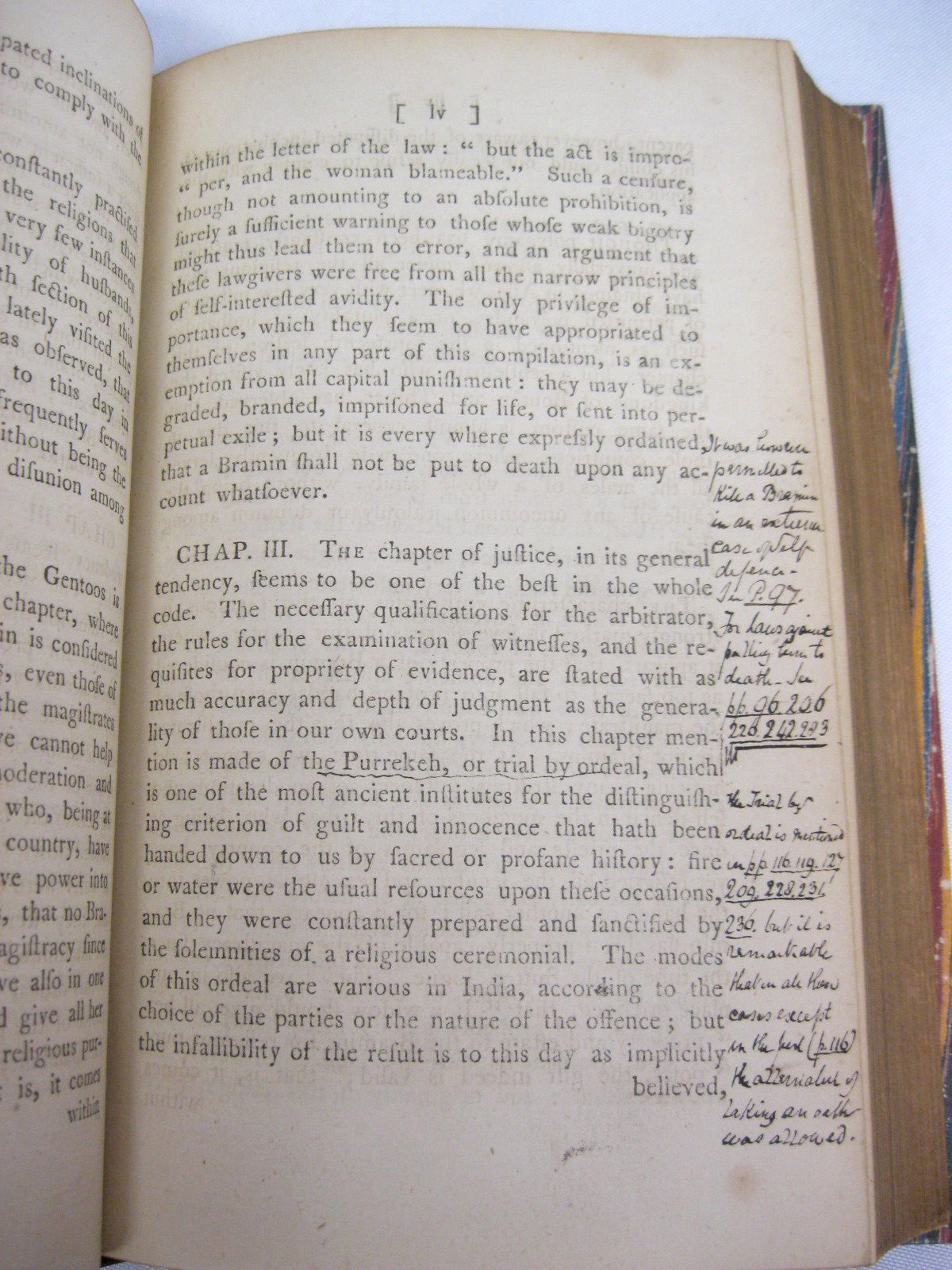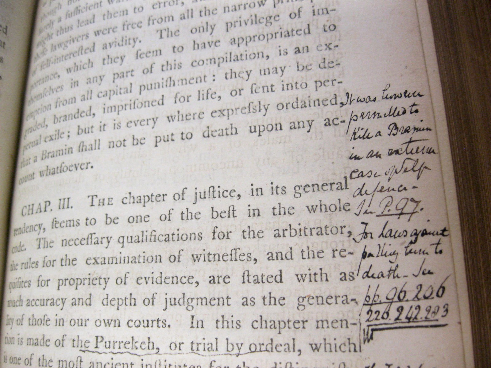 Whoever the previous owner was, there are some curious notations, particularly on page LV of the preface. The paragraph to which the note refers concludes: "...but it is everywhere expressly ordained that a Brahmin shall not be put to death upon any account whatsoever." To which is written in the margin: "I was however permitted to kill a Brahmin in an ____(?) case of self defence." (see photo) That was a surprising bit of marginalia to come across!