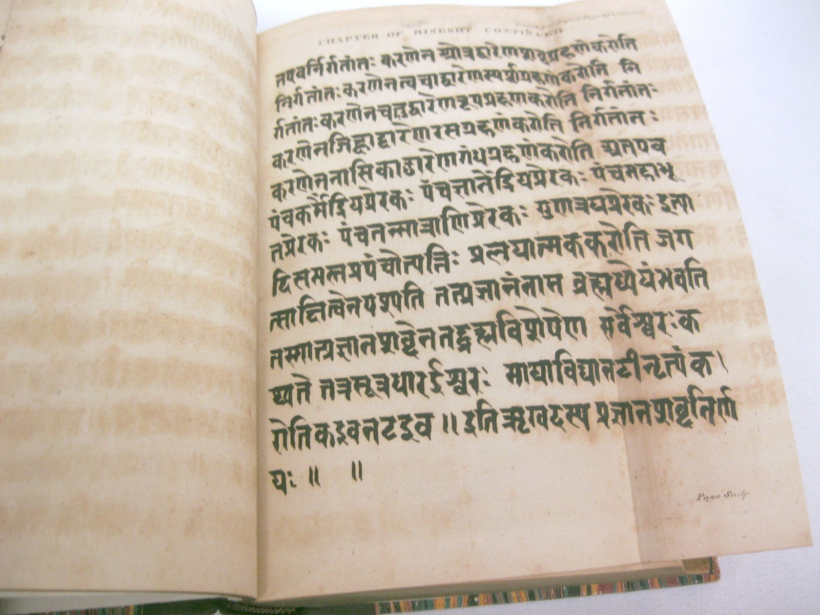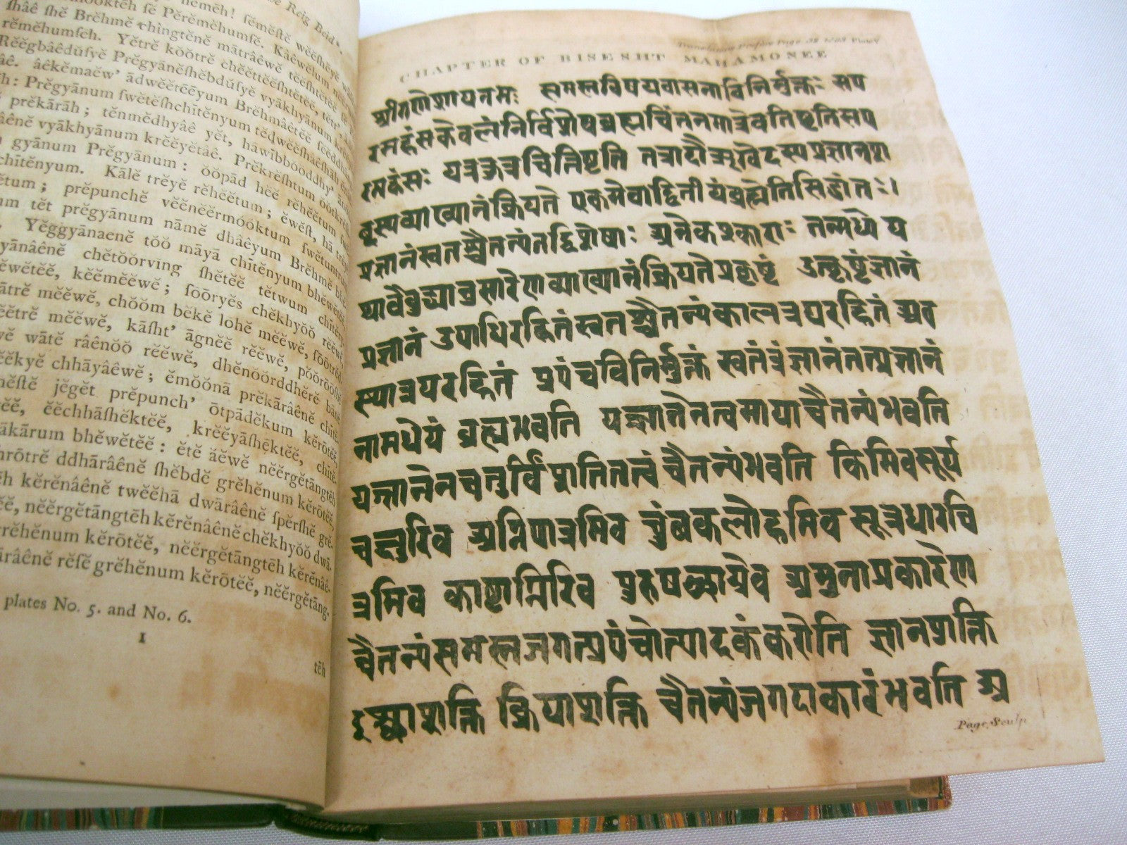 Includes several plates of selected Sanskrit writings, some of which fold-out. The printing "ghosts" through most of these pages to some extent, unsurprisingly, as the print is dark and heavy.
