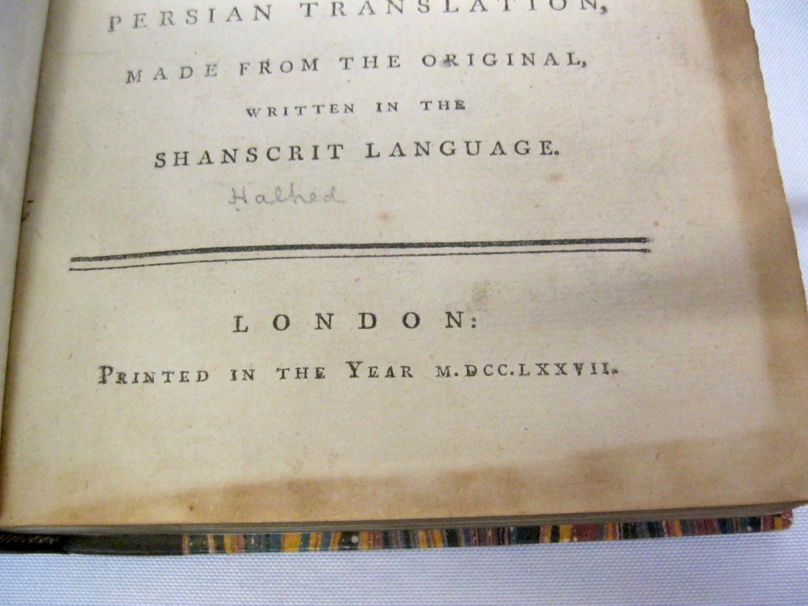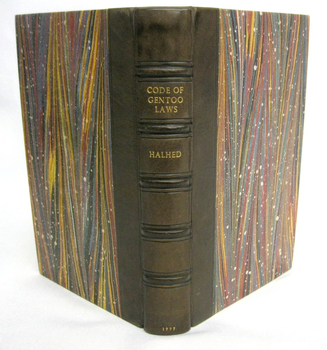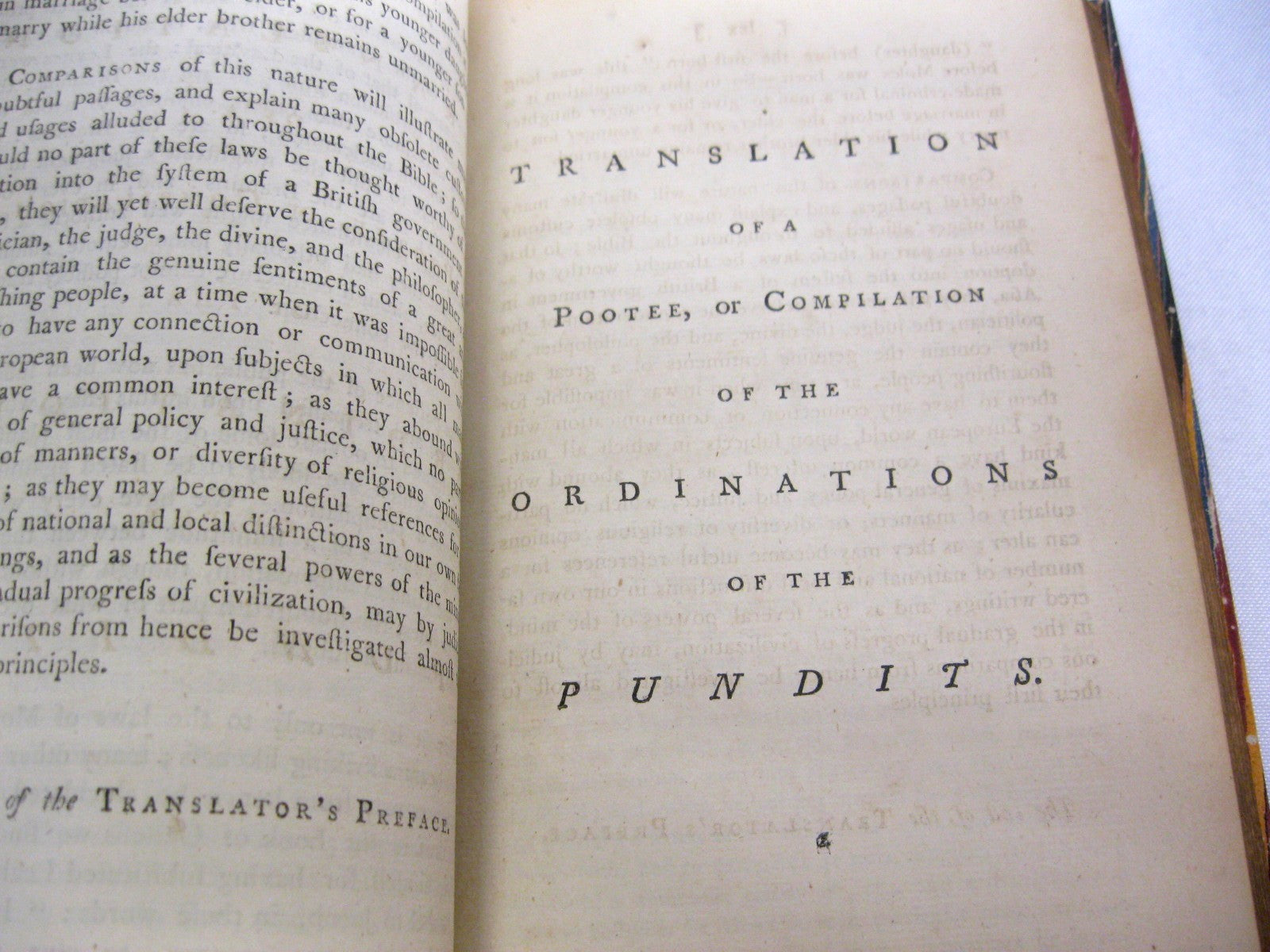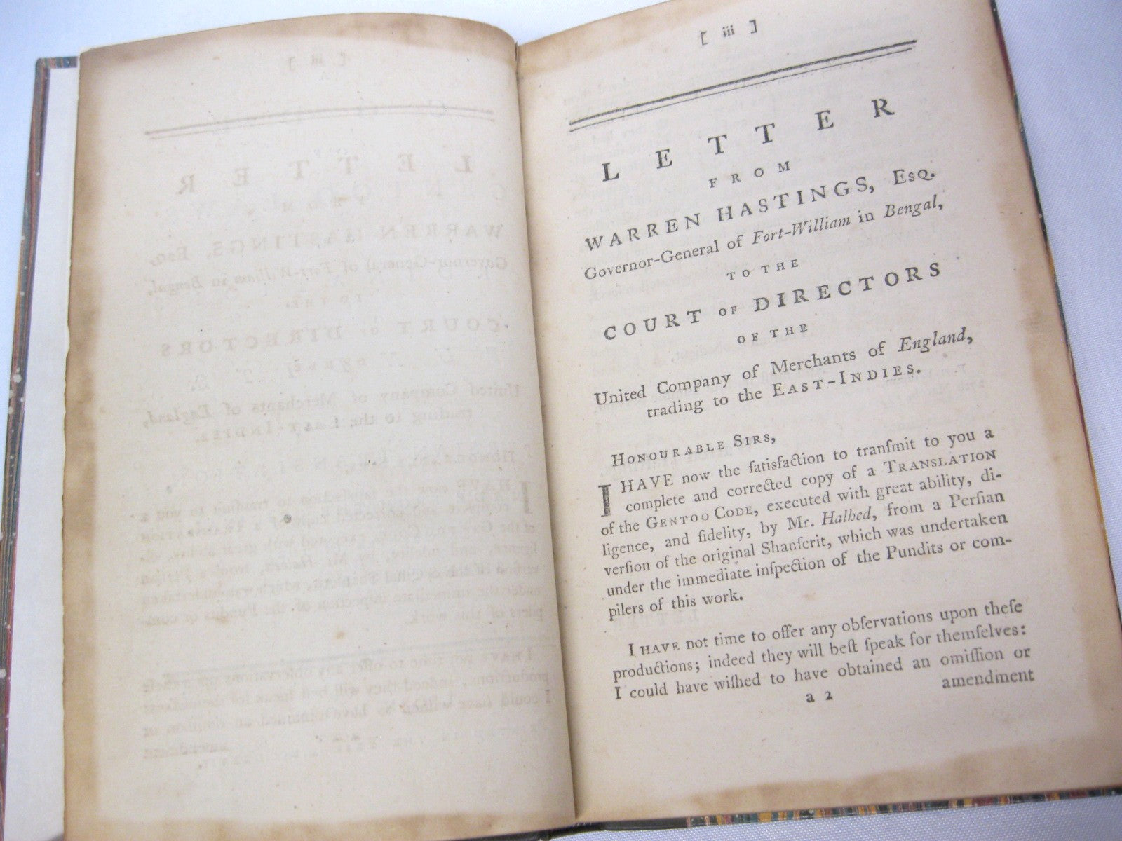 Second printing. This is the 1777 edition, London, which is said to be a pirated edition. The book was originally published in 1776, privately printed by the East India Company, and an official second edition came out in 1781. The book was commissioned by Warren Hastings of the East India Company, and was compiled with the help of eleven pandits/Brahmin scholars, and translated by Nathaniel Brassey Halhed, with the aim of being used by members of the East India Company.
