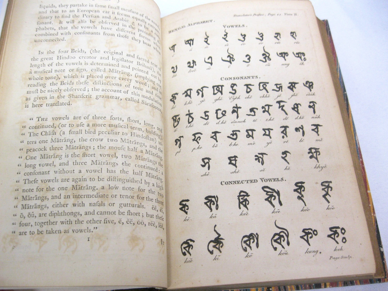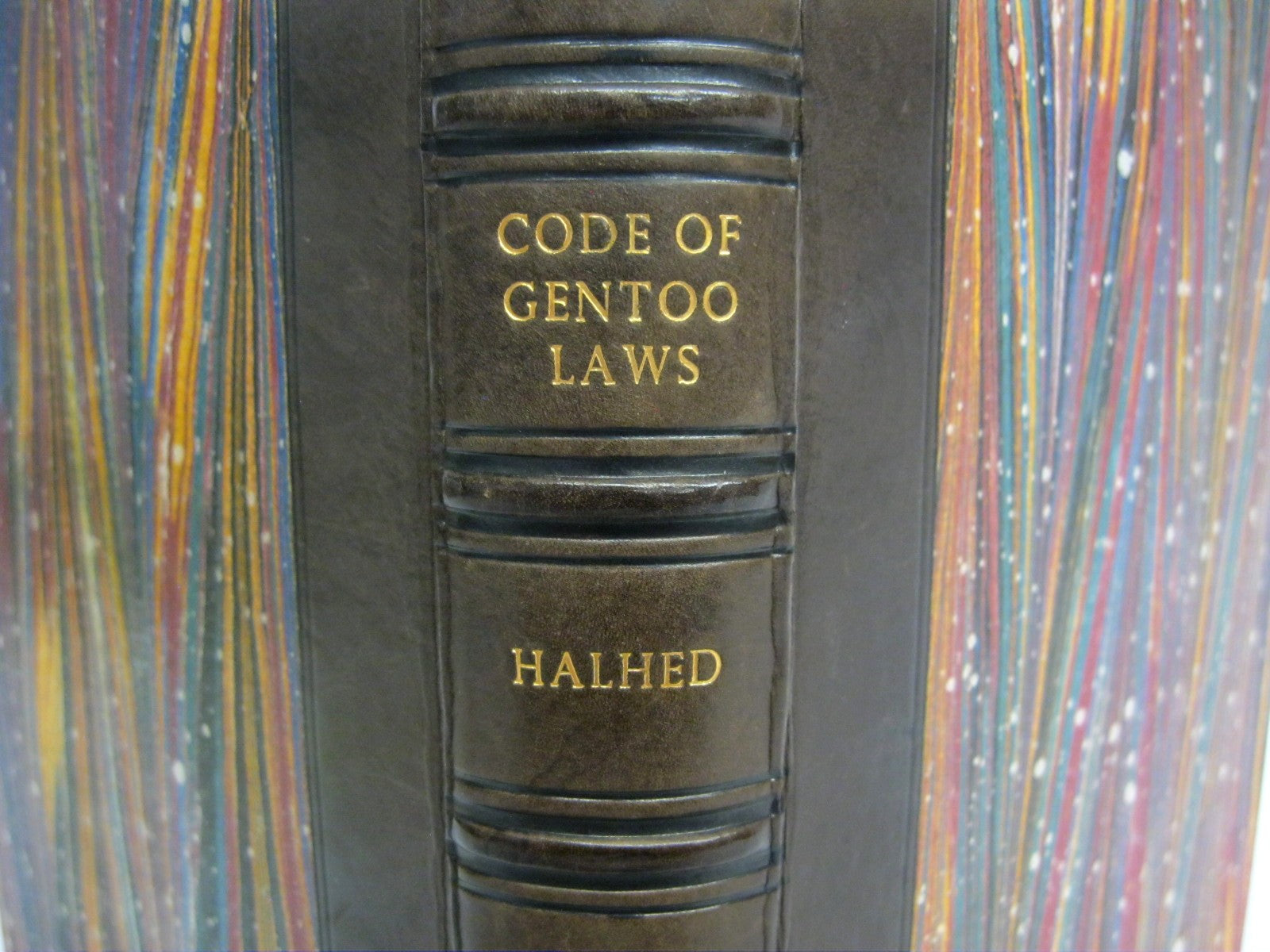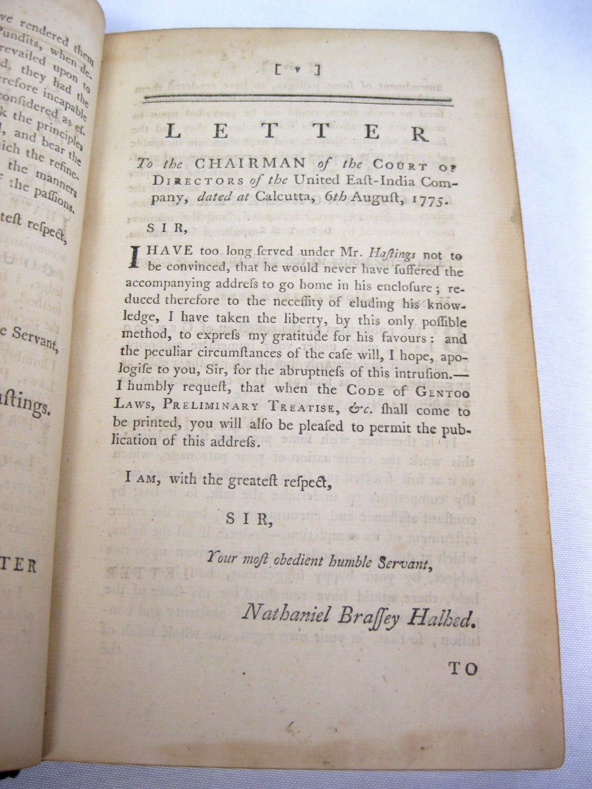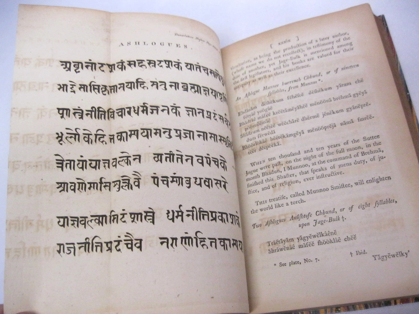 Second printing. This is the 1777 edition, London, which is said to be a pirated edition. The book was originally published in 1776, privately printed by the East India Company, and an official second edition came out in 1781. The book was commissioned by Warren Hastings of the East India Company, and was compiled with the help of eleven pandits/Brahmin scholars, and translated by Nathaniel Brassey Halhed, with the aim of being used by members of the East India Company.