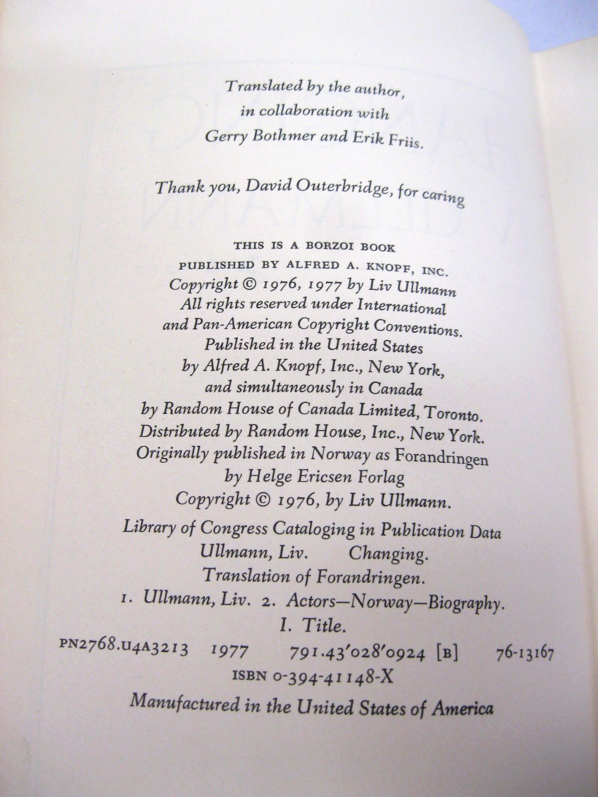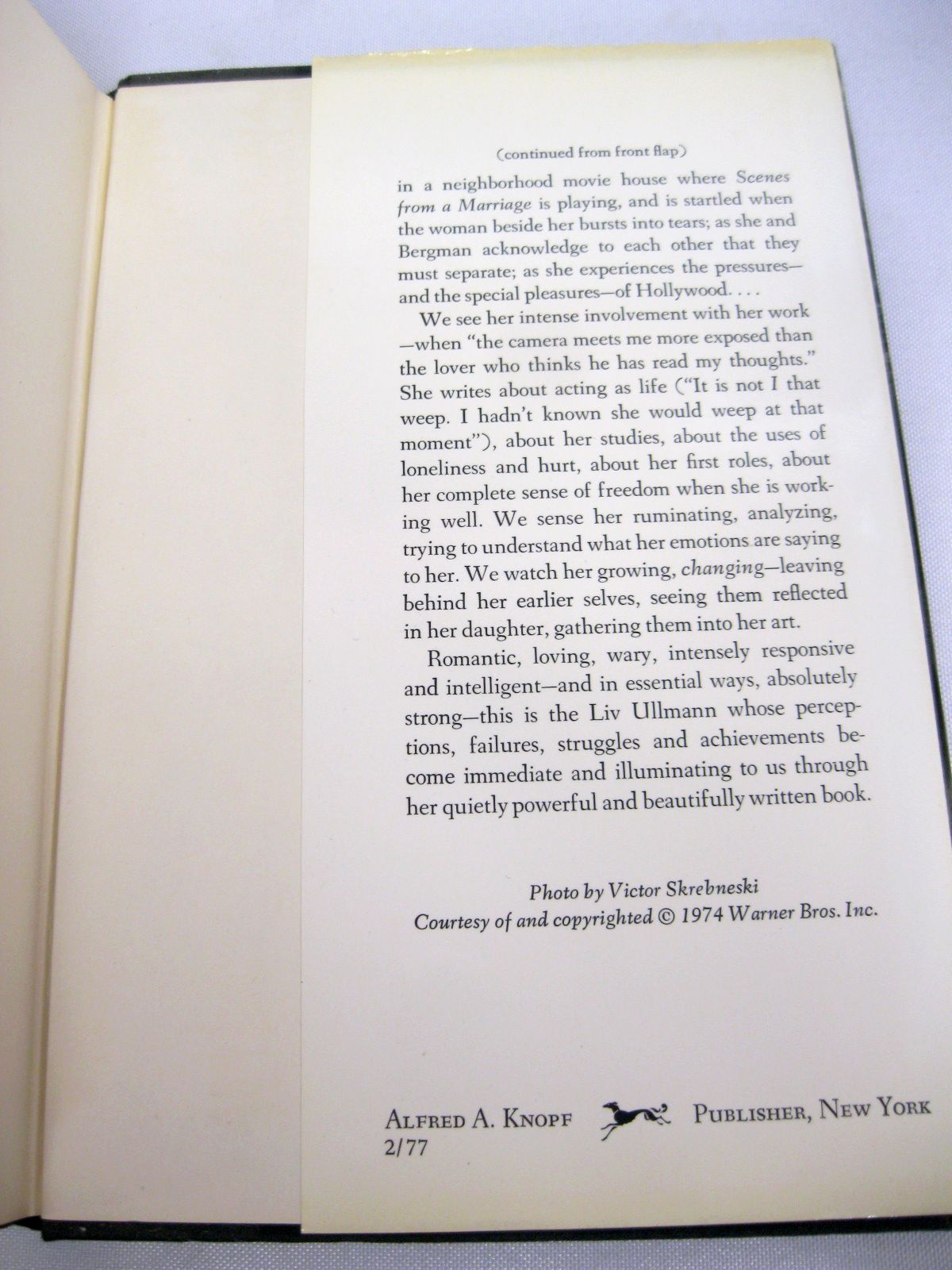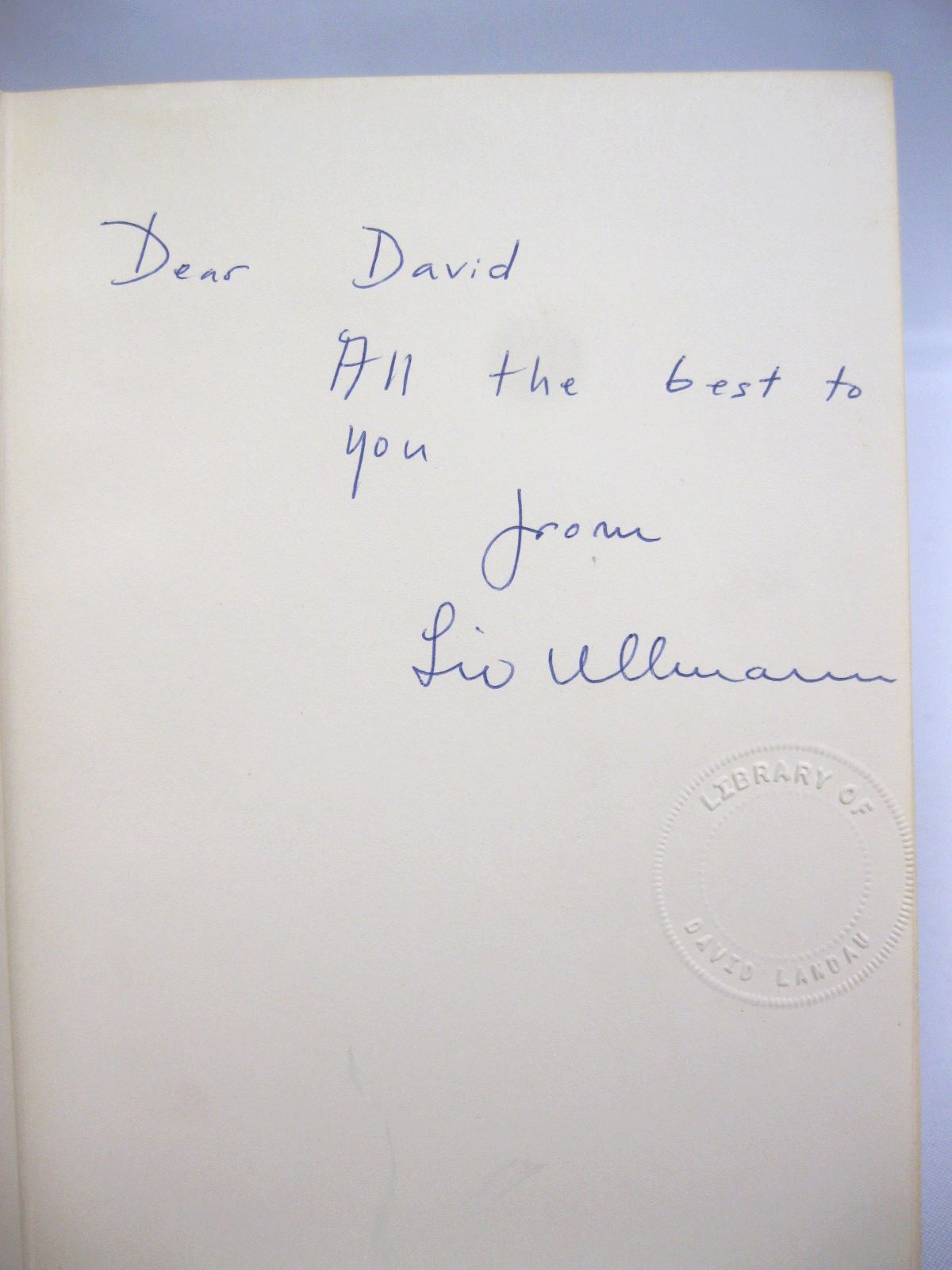 SIGNED and inscribed by Ullmann on ffep: "Dear David, All the best to you, from Liv Ullmann" with David's blindstamp visible below.