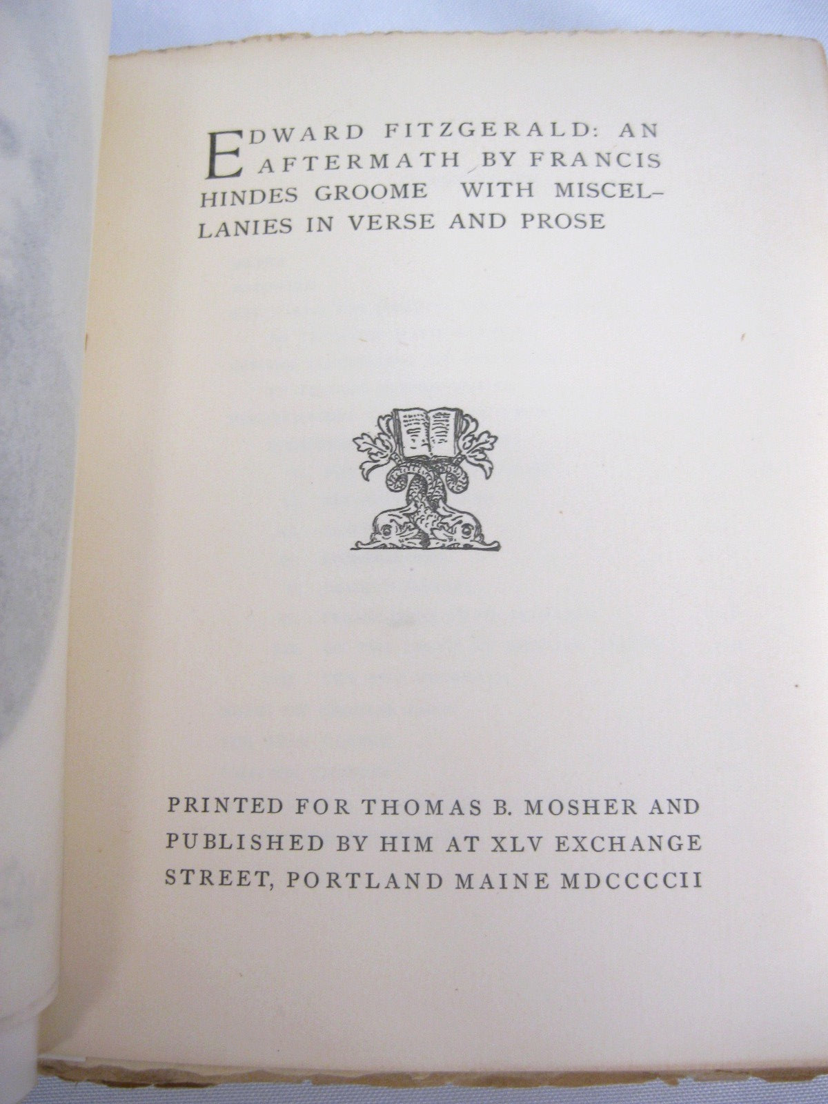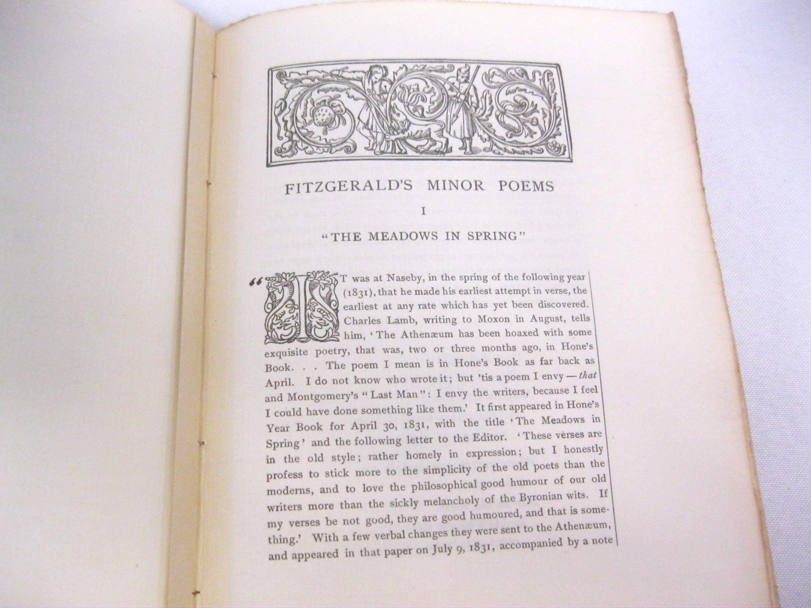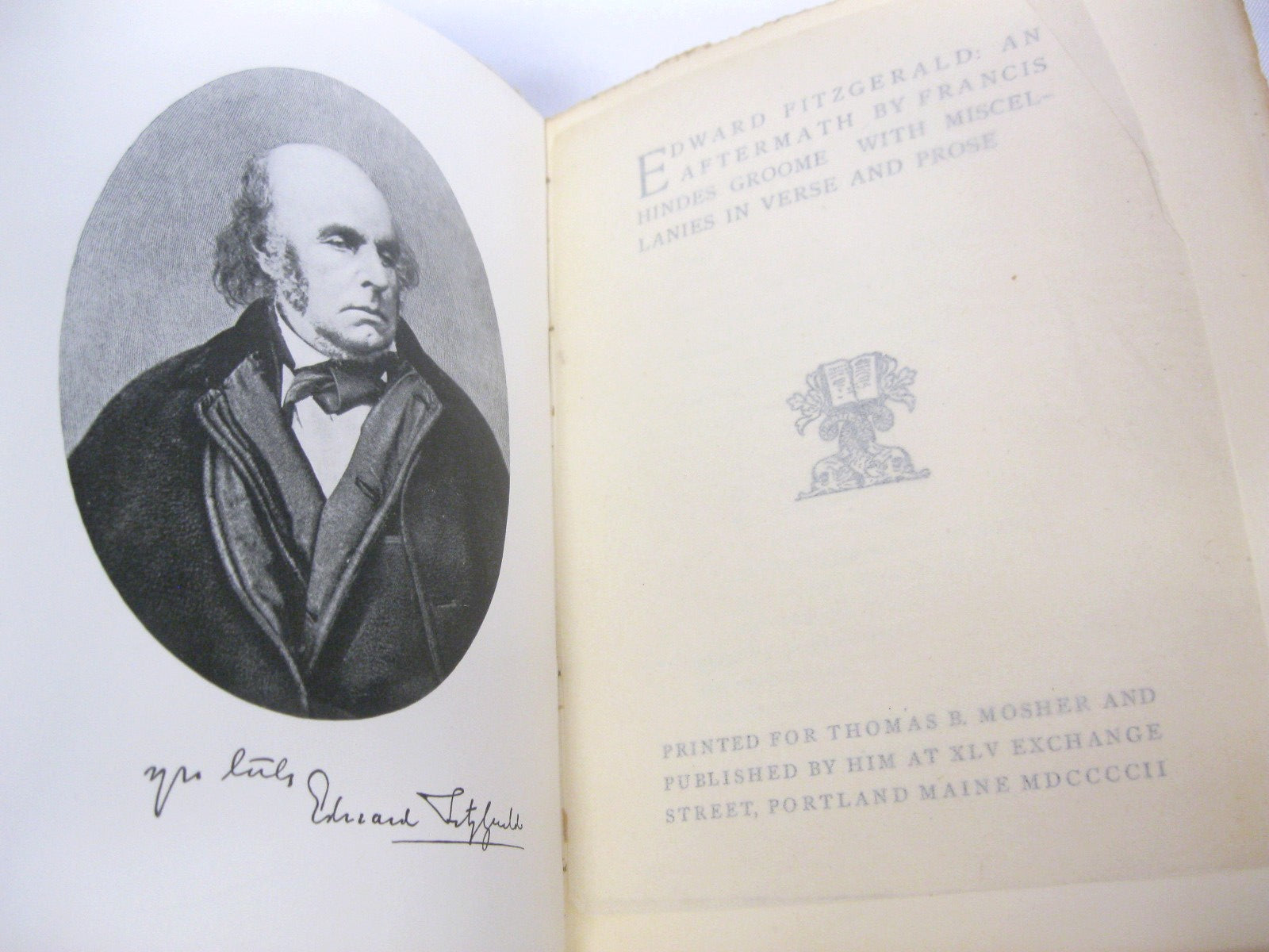 Limited edition of 600 printed on Van Gelder hand-made paper. Front inside page includes one of Fitzgerald's own bookplates pasted-in. Interestingly, the bookplate was designed in 1842 by English poet and friend of Fitzgerald, William Makepeace Thackeray.