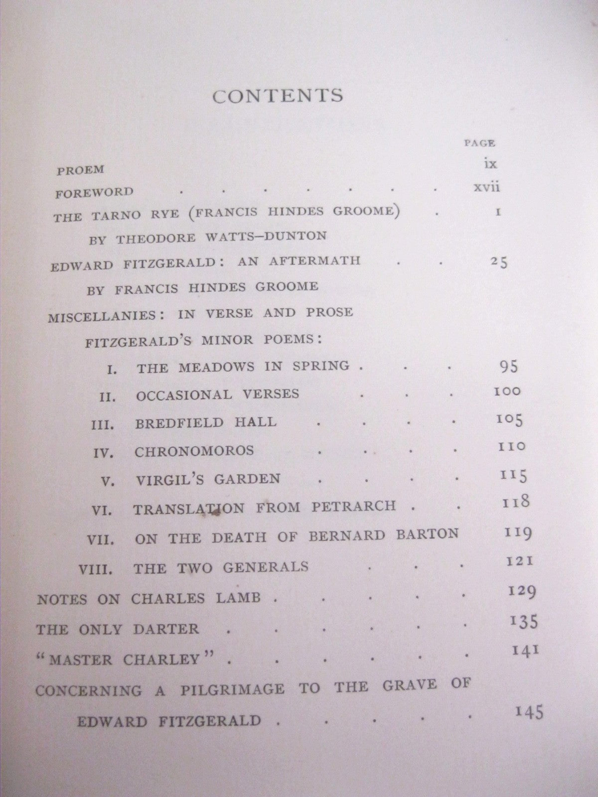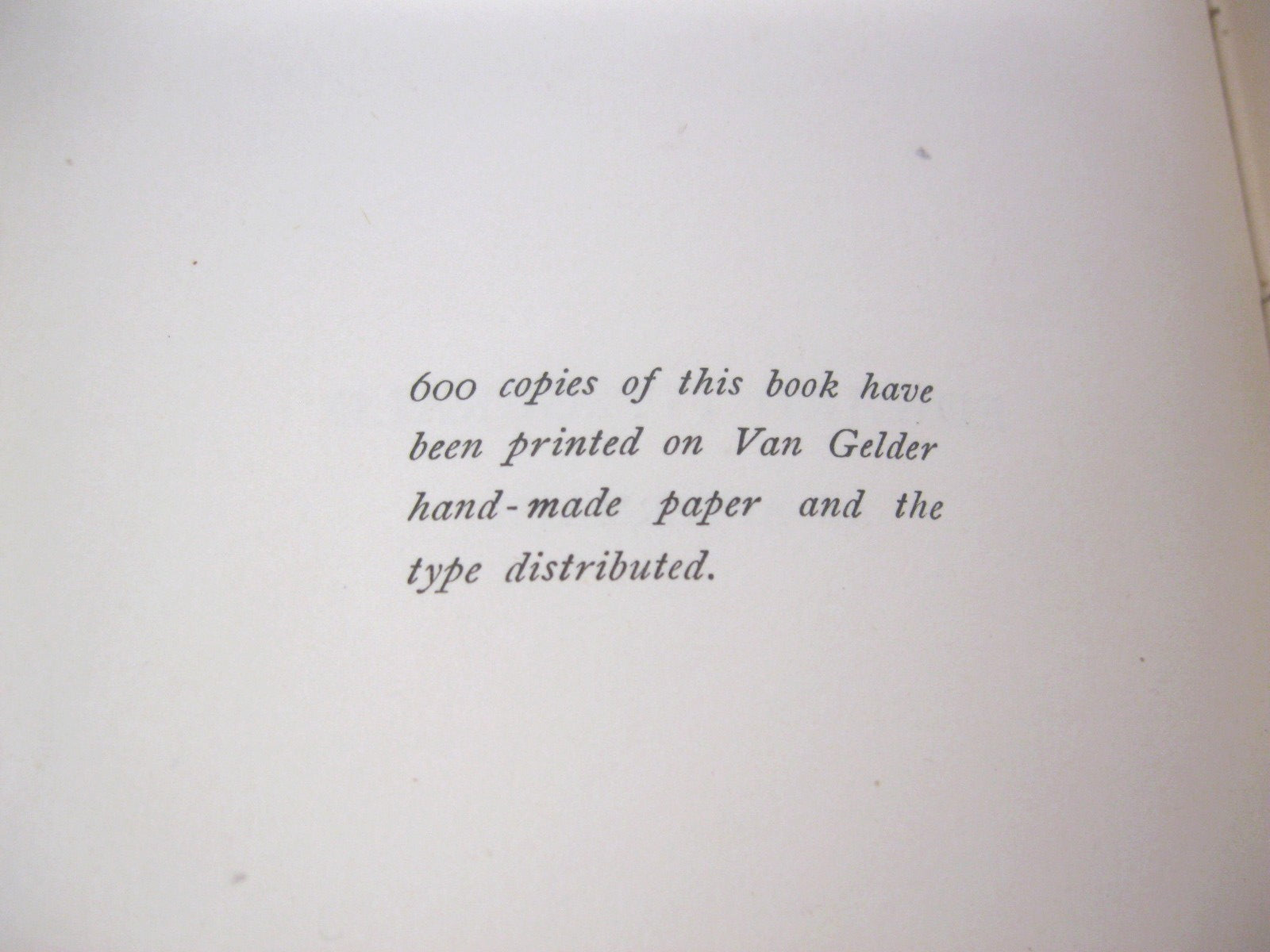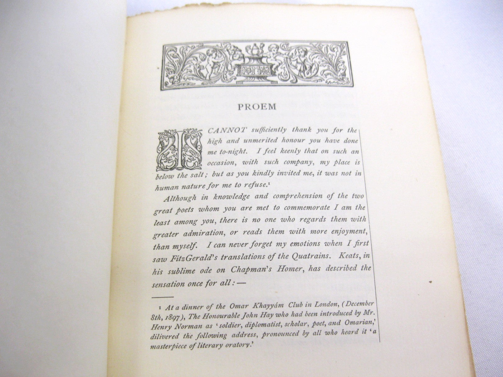 Limited edition of 600 printed on Van Gelder hand-made paper. Front inside page includes one of Fitzgerald's own bookplates pasted-in. Interestingly, the bookplate was designed in 1842 by English poet and friend of Fitzgerald, William Makepeace Thackeray.