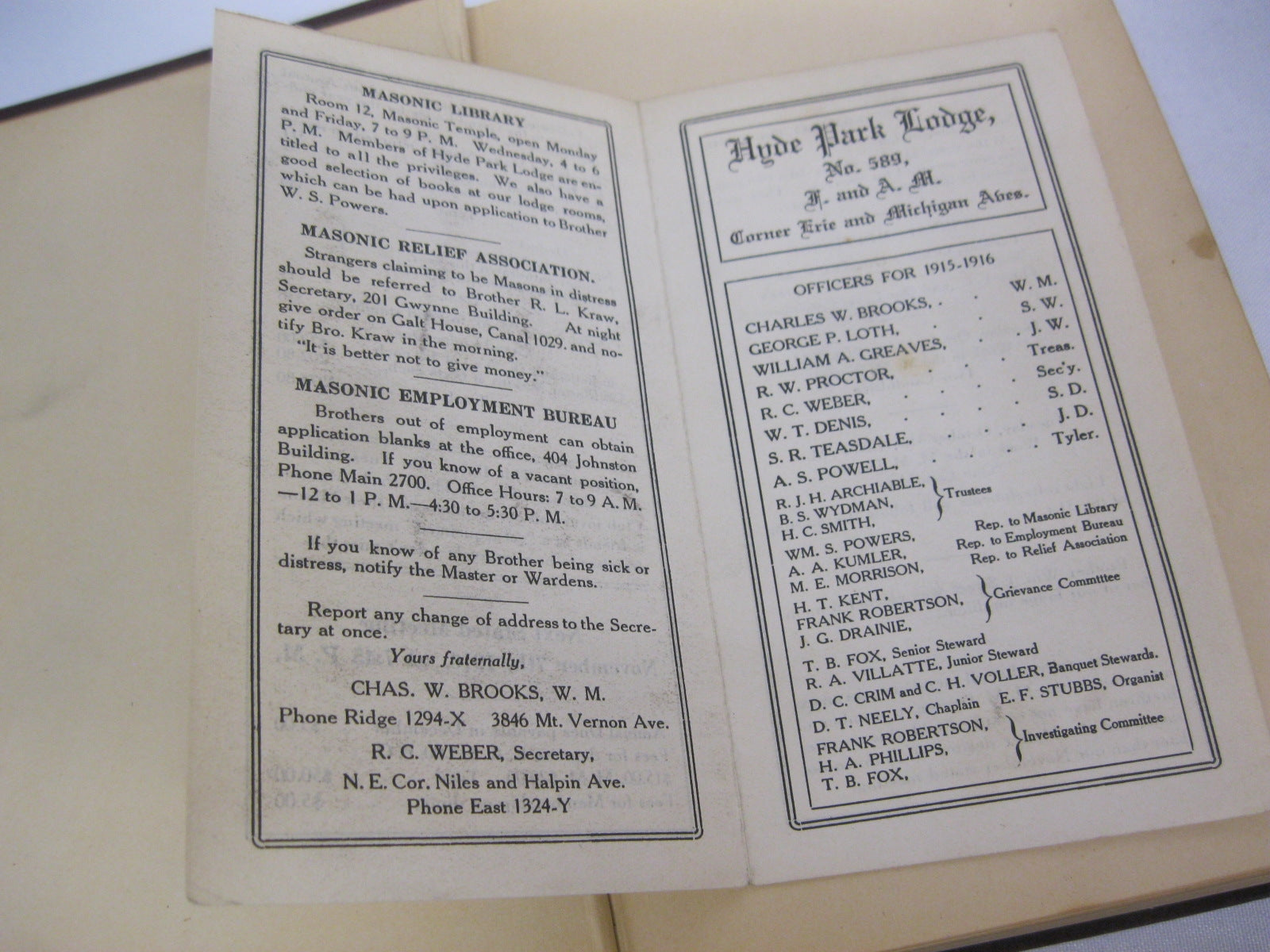 Includes three fold-out illustrations. Also includes a small loose trifold for the Hyde Park Lodge, 1916, which is in very good condition except that someone drew a 3D cube in pencil on one page.