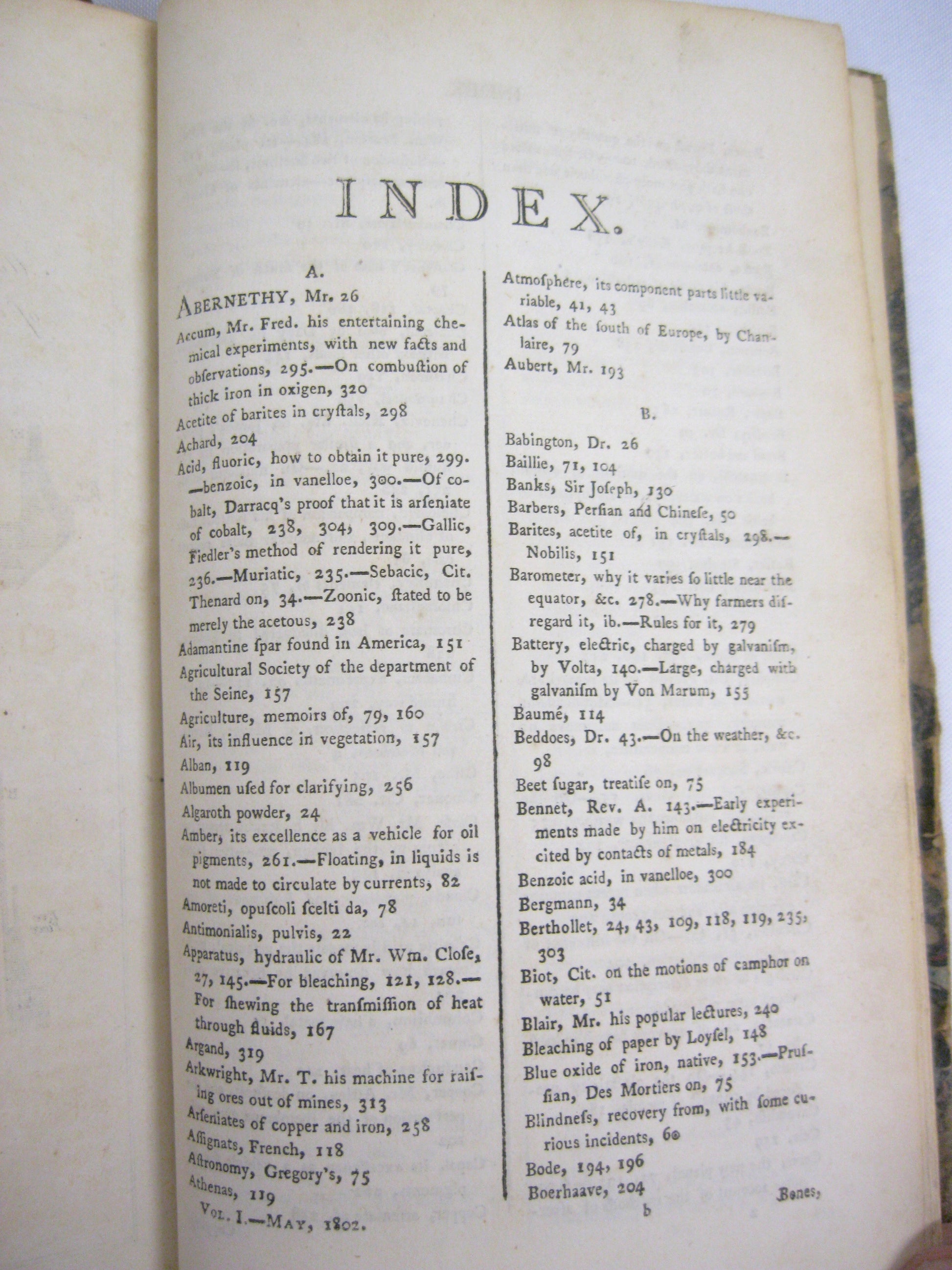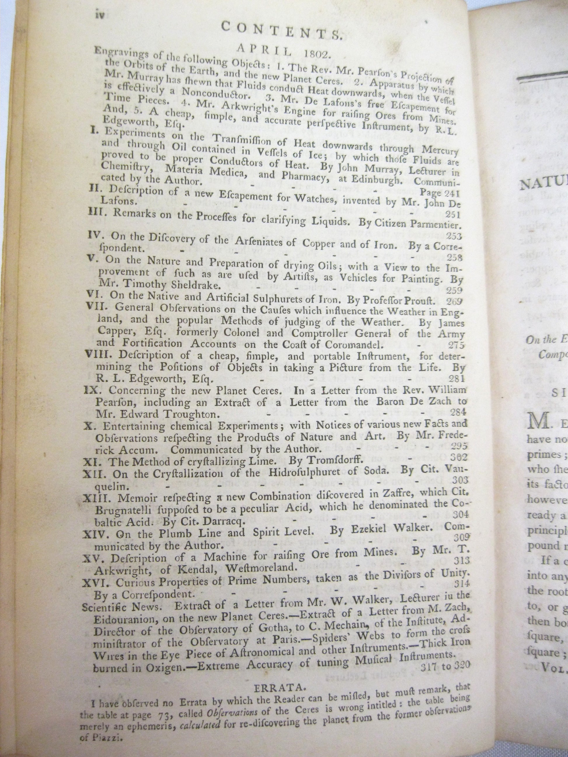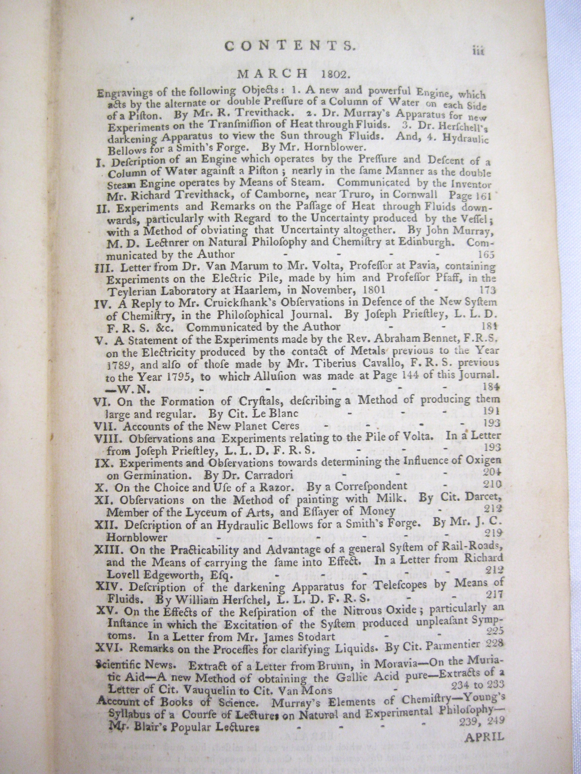Contains articles on the many major scientific advancements and discoveries of the day, including discussion of the discovery of the planet Ceres (now considered a dwarf planet, between Mars and Jupiter). Articles on hydraulics and galvanism and electrocity. Herchel's observations on the Sun. An article about Prussian blue. Benefits of rail roads. "Narrative and explanation of the appearance of phantoms and other figures in the exhibition of the phantasmagoria." And many other various scientific things.