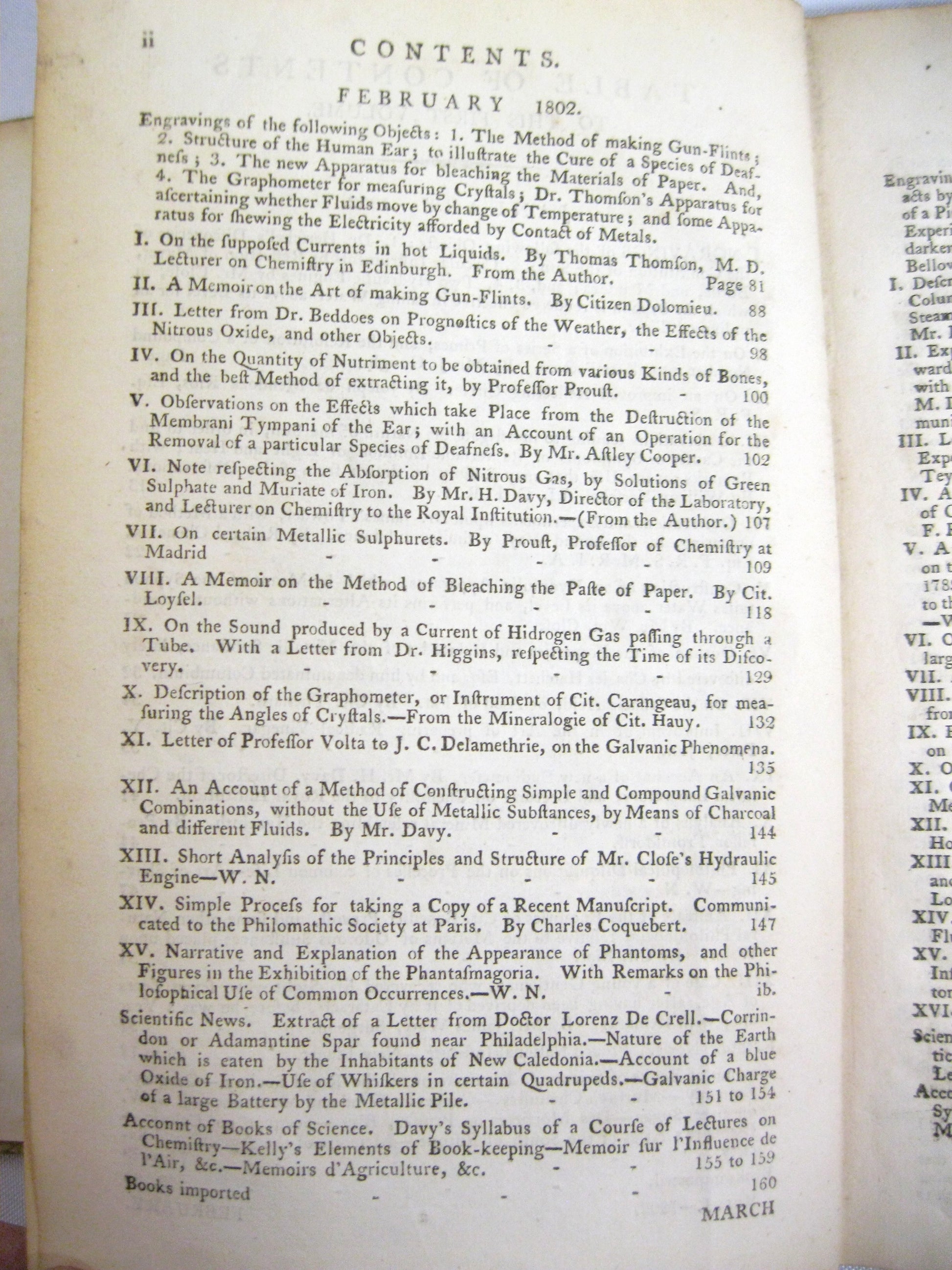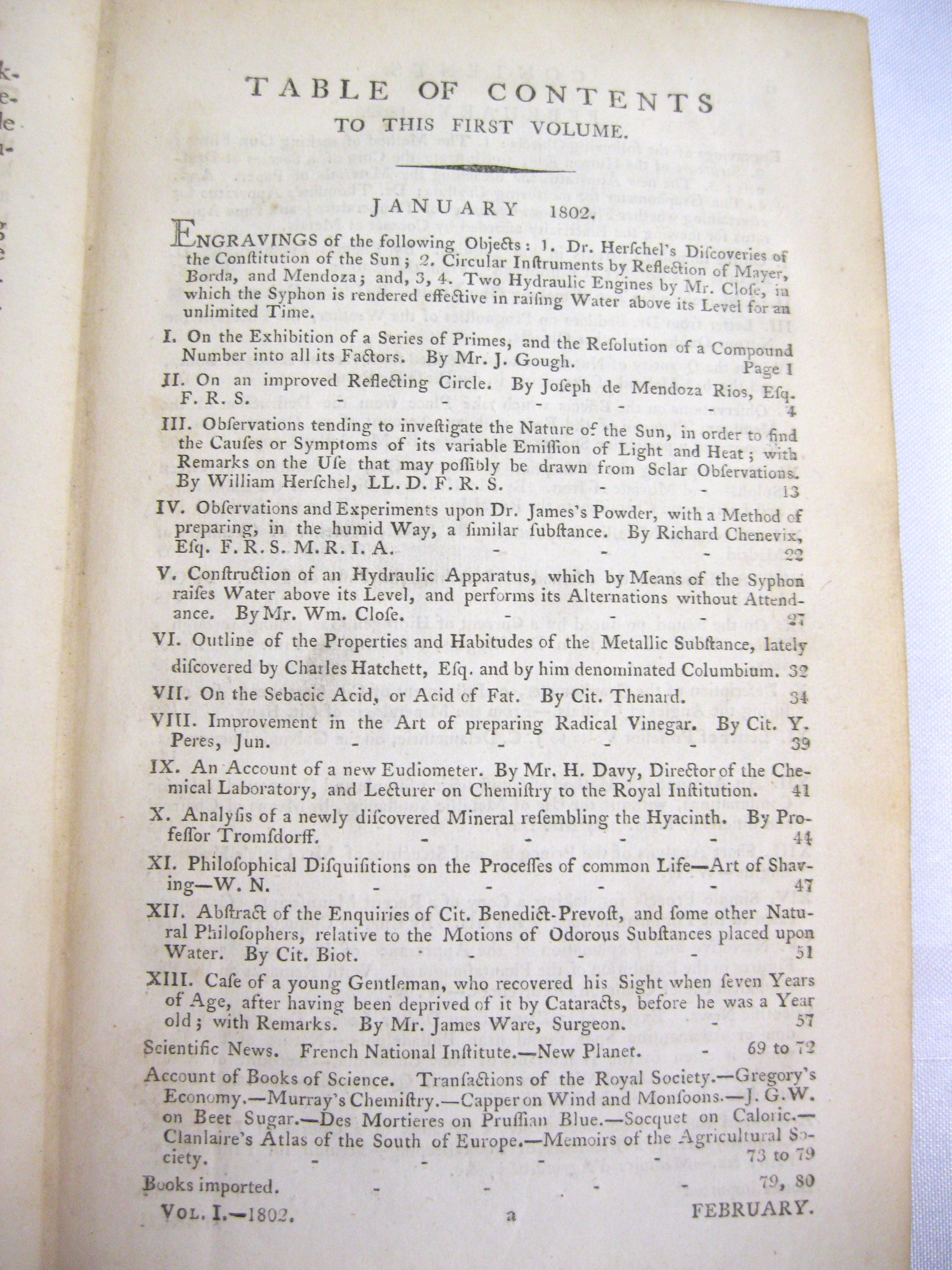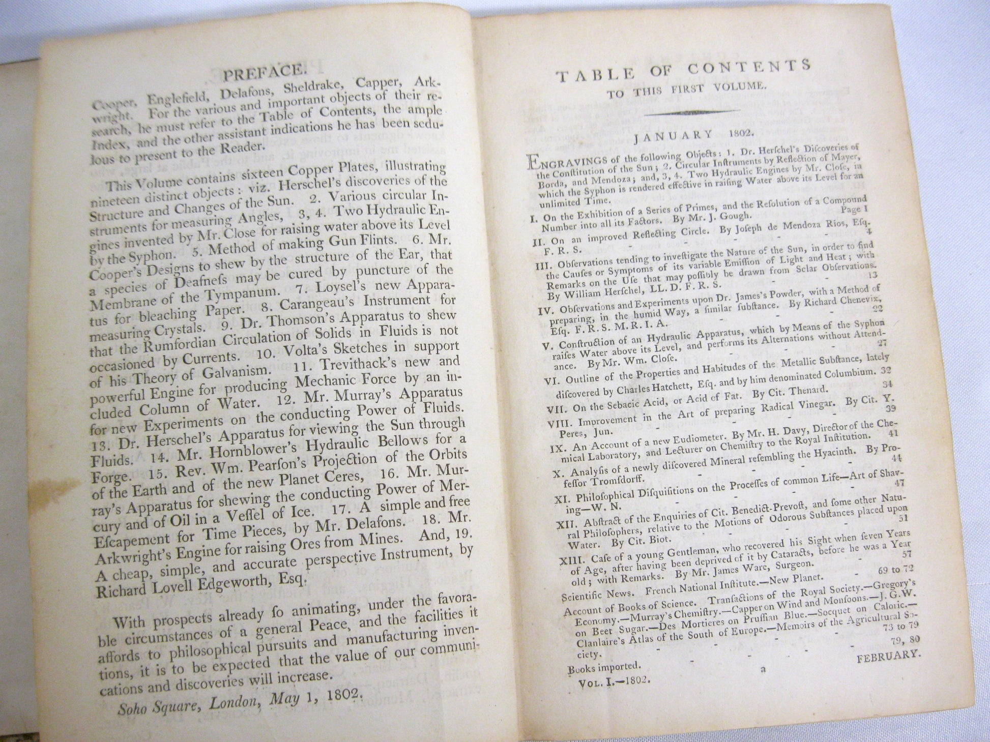 Contains articles on the many major scientific advancements and discoveries of the day, including discussion of the discovery of the planet Ceres (now considered a dwarf planet, between Mars and Jupiter). Articles on hydraulics and galvanism and electrocity. Herchel's observations on the Sun. An article about Prussian blue. Benefits of rail roads. "Narrative and explanation of the appearance of phantoms and other figures in the exhibition of the phantasmagoria." And many other various scientific things.