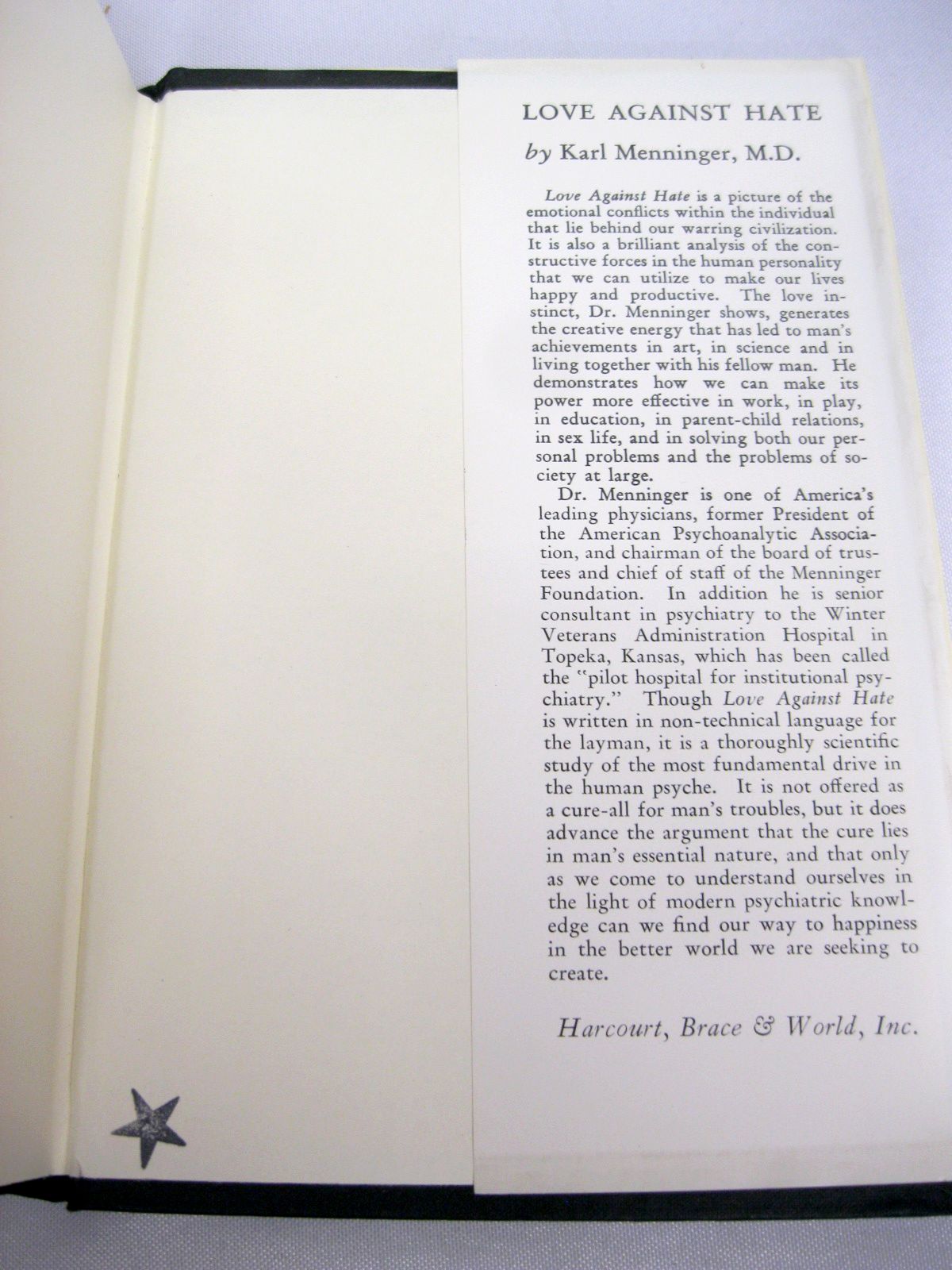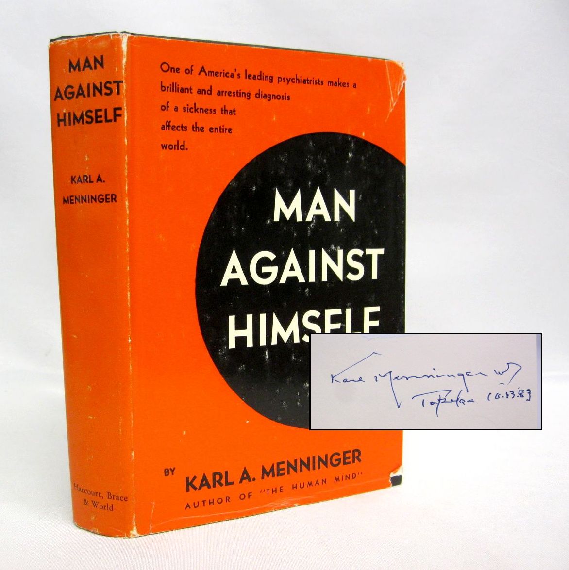Condition: Hardcover; dust jacket has minor scuffing, edge wear with some small tears at corners. Front-flap has been price-clipped. Previous owner's name appears to have been whited-out on ffep, just above Menninger's signature, fairly discreet. Only other mark in the book is a small black star stamp on the inside back cover. Otherwise the book is clean, neat, and the binding is firm.