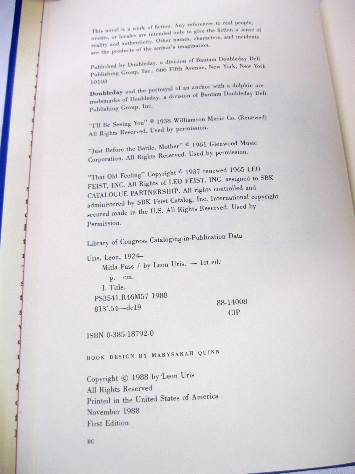 SIGNED and inscribed by Uris on ffep: "For Annette Silver, Shalom, Leon Uris"