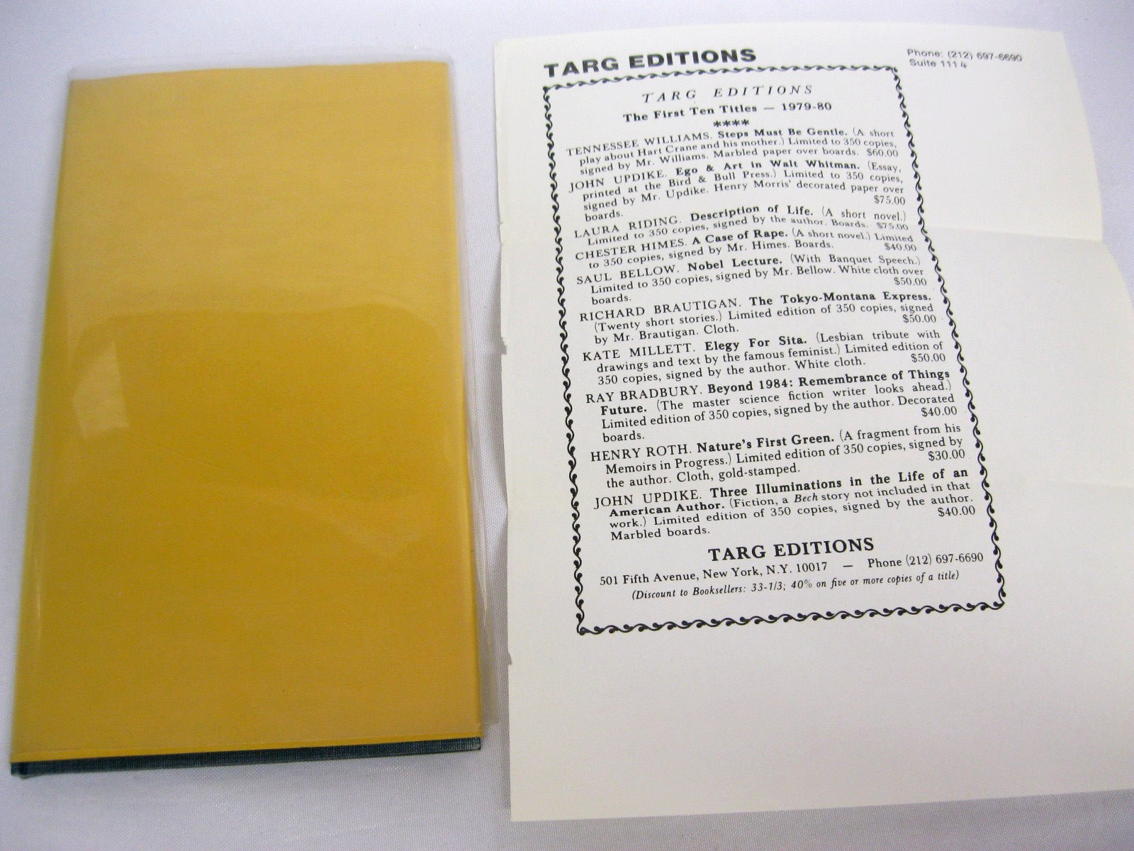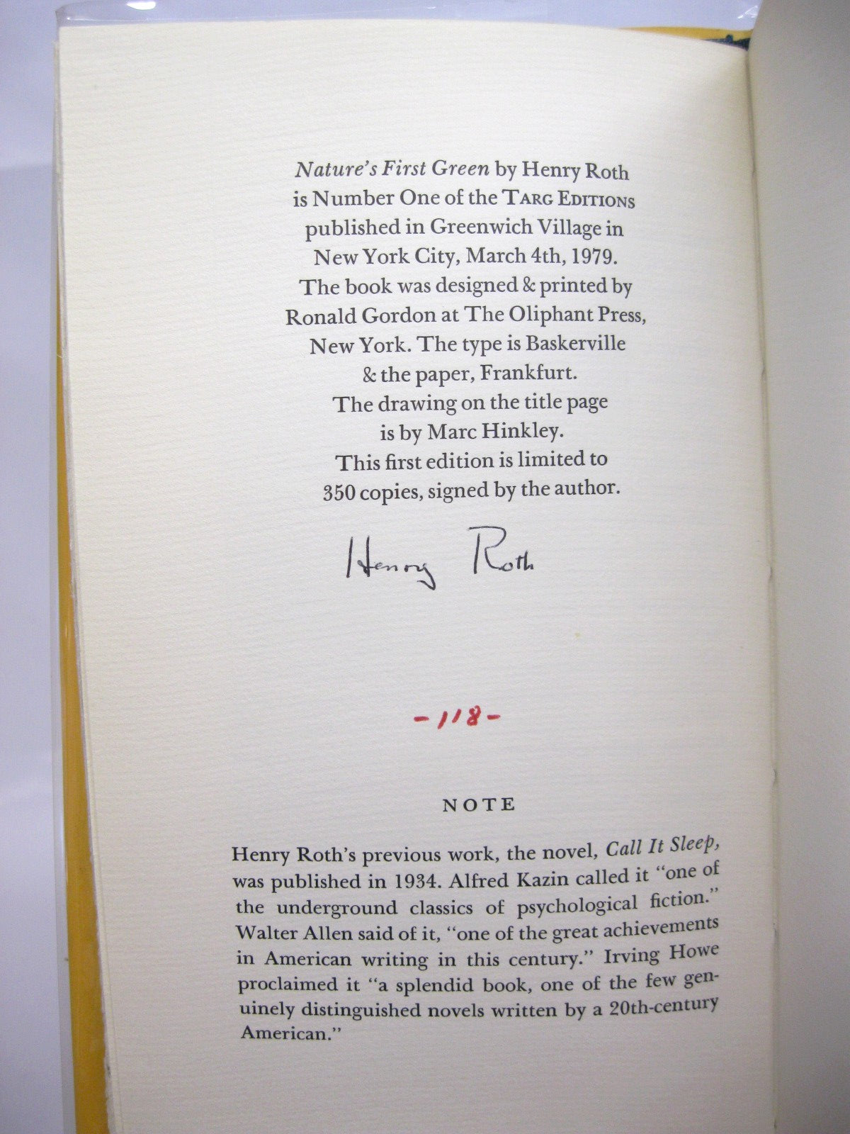 SIGNED by Roth on the final, limitation page, #181 of 350 copies. Includes a separate page advertising Targ's first ten titles.