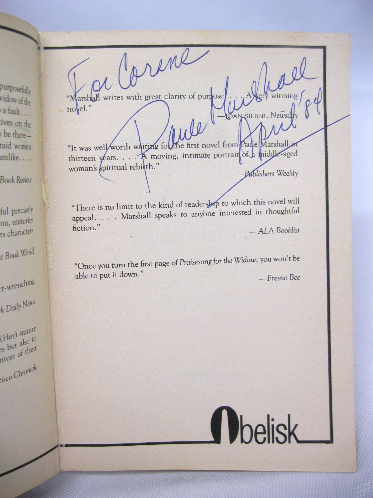 SIGNED by Marshall on front page: "For Corene, Paule Marshall, April '84"