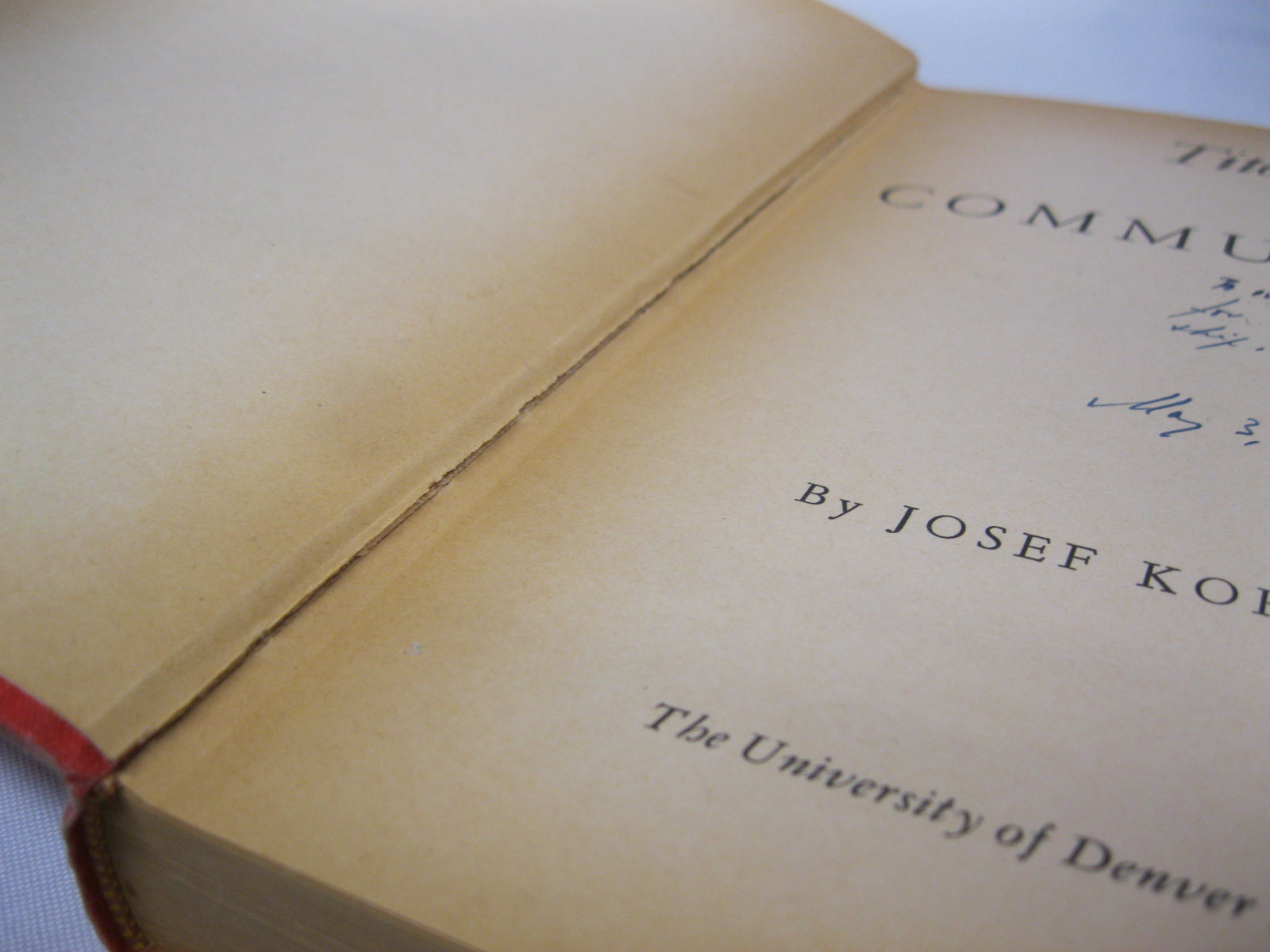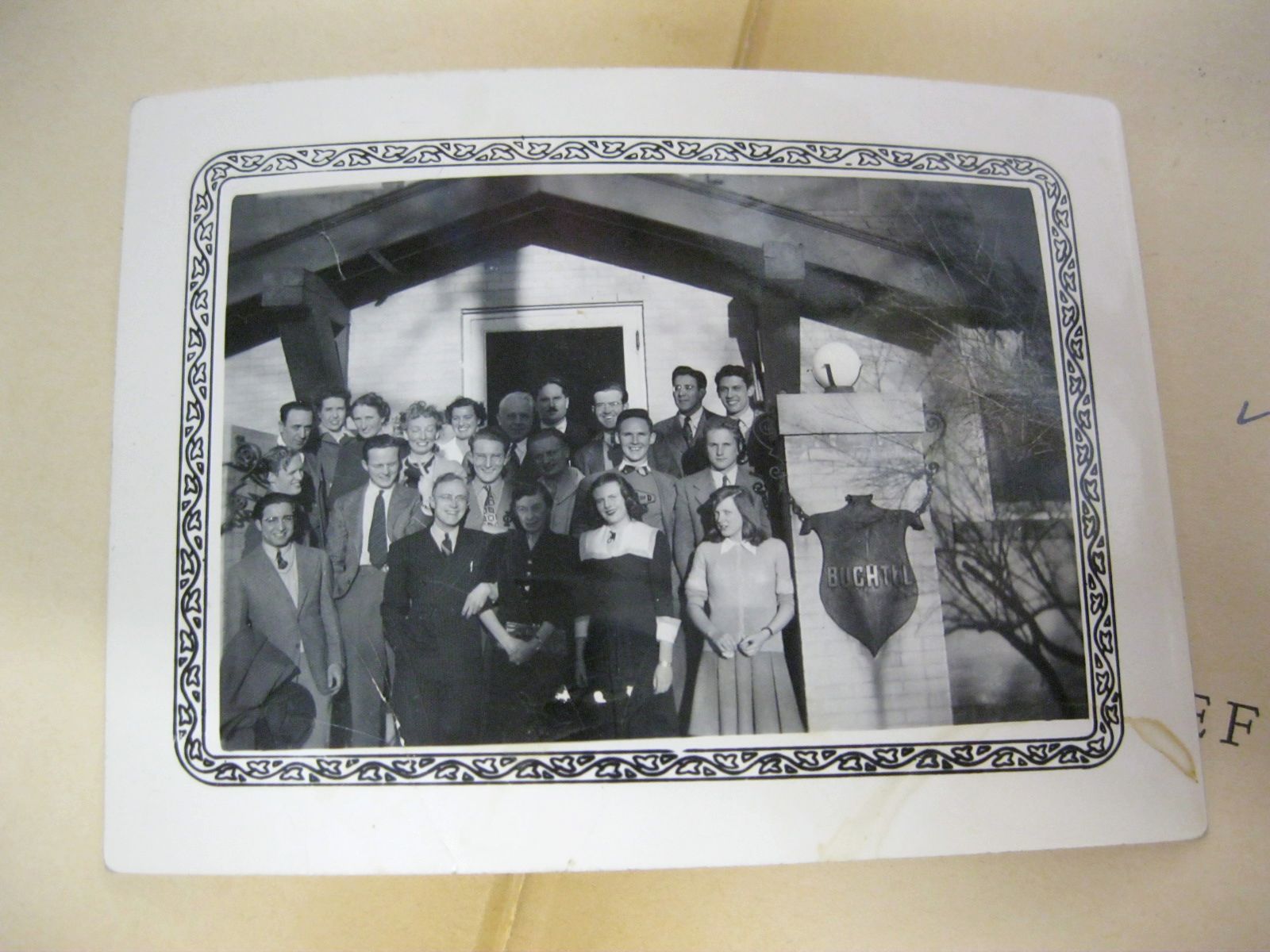The book includes a 3"x4" inch black and white photo of a group of presumably faculty, maybe also some students, in front of the Buchtel Bungalow on the University of Denver campus, circa early 1950s. It seems likely Josef Korbel would be in the photo, in which case he would likely be the one on the bottom left corner, or the one in glasses in the upper right corner. DU's School of International Studies is named after Korbel.