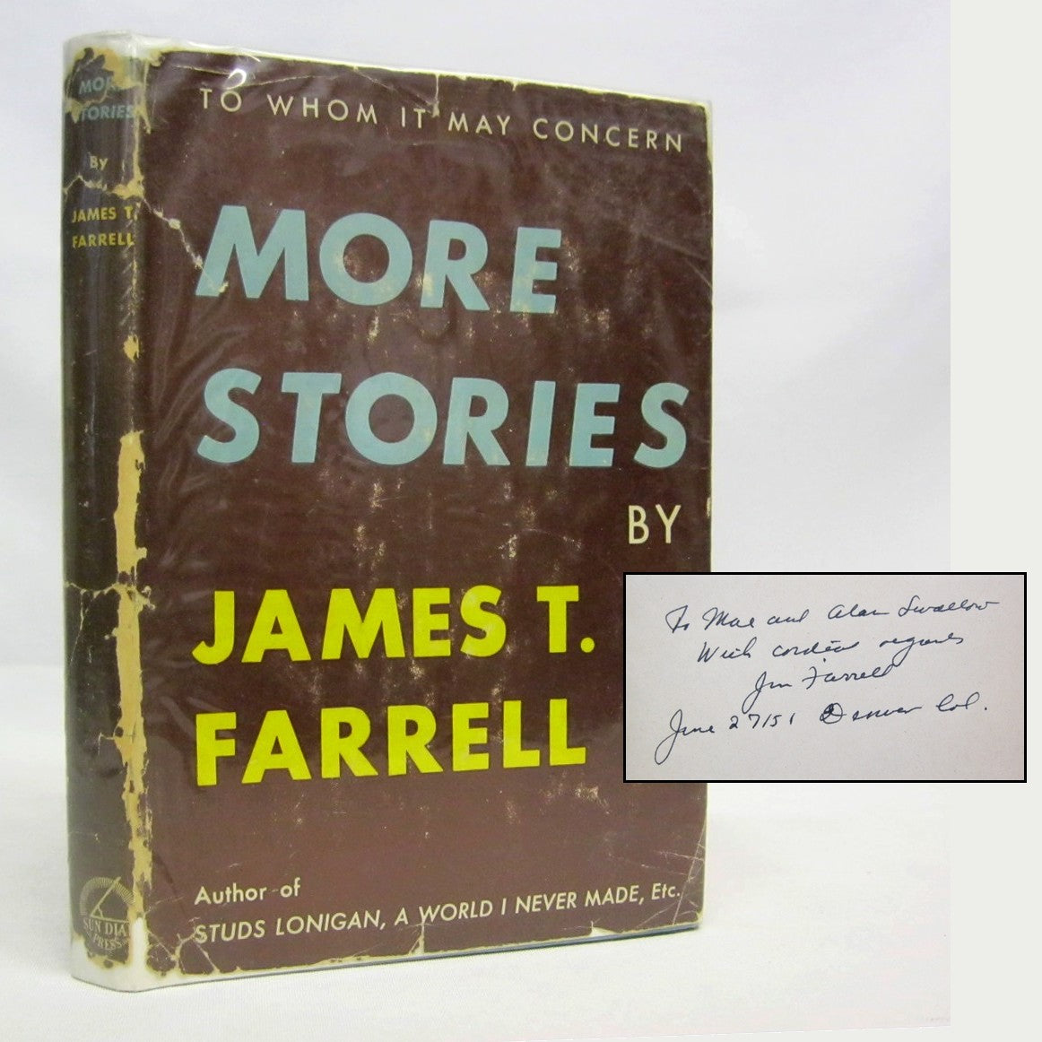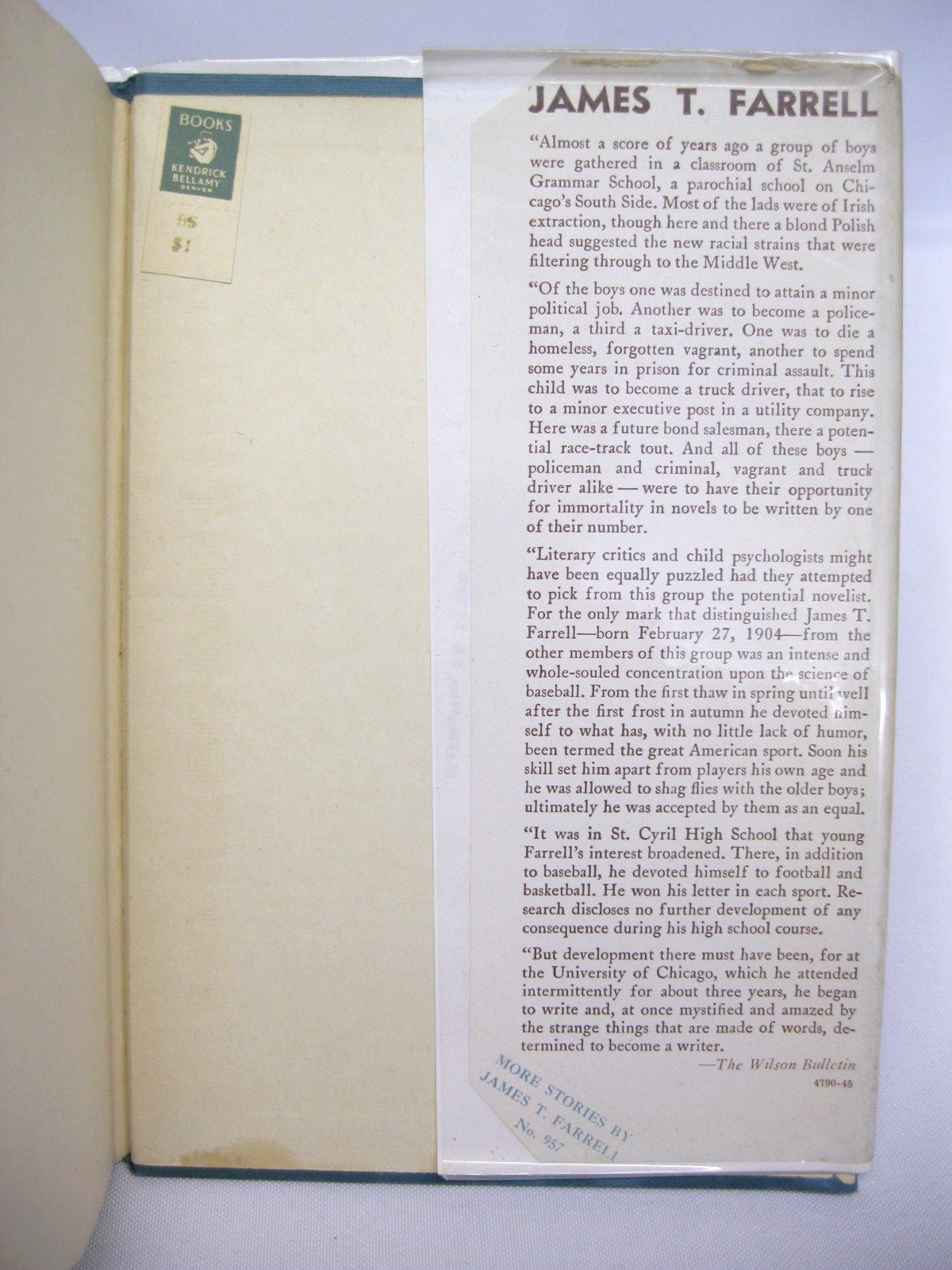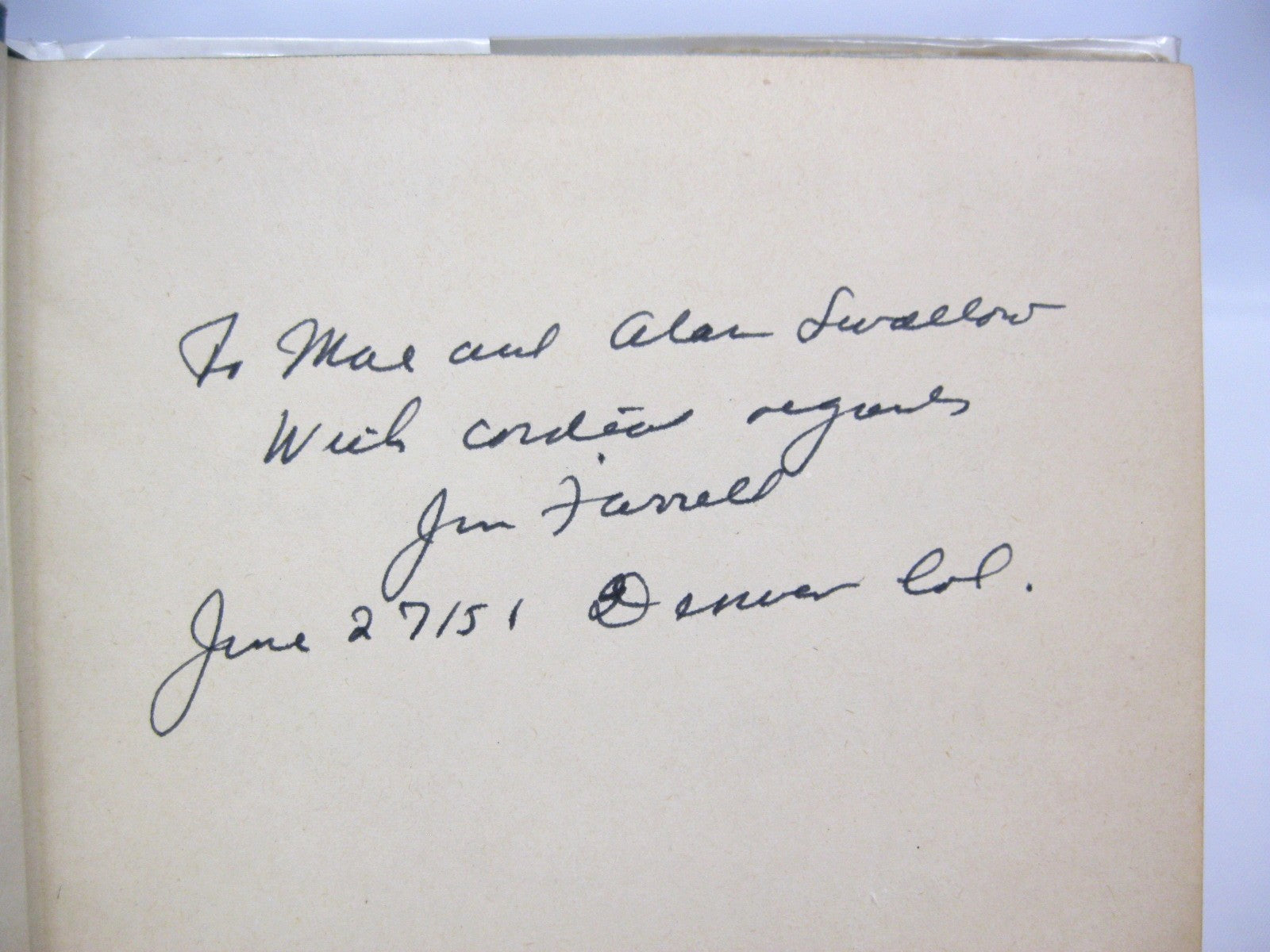 SIGNED and inscribed by Farrell on ffep: "To Mae and Alan Swallow with cordial regards / Jim Farrell, June 27/51, Denver CO". Alan Swallow was an American poet and professor of English at the University of Denver, who was mentored by Robert Penn Warren, and had his own namesake publishing business.