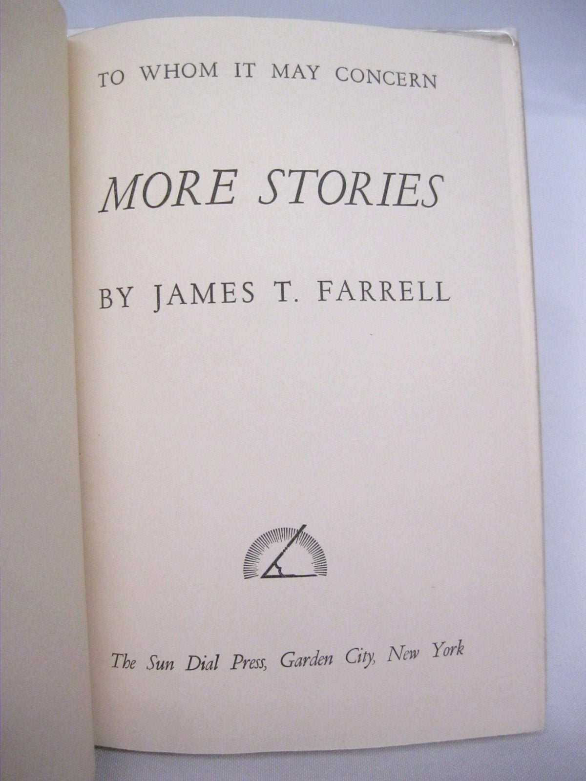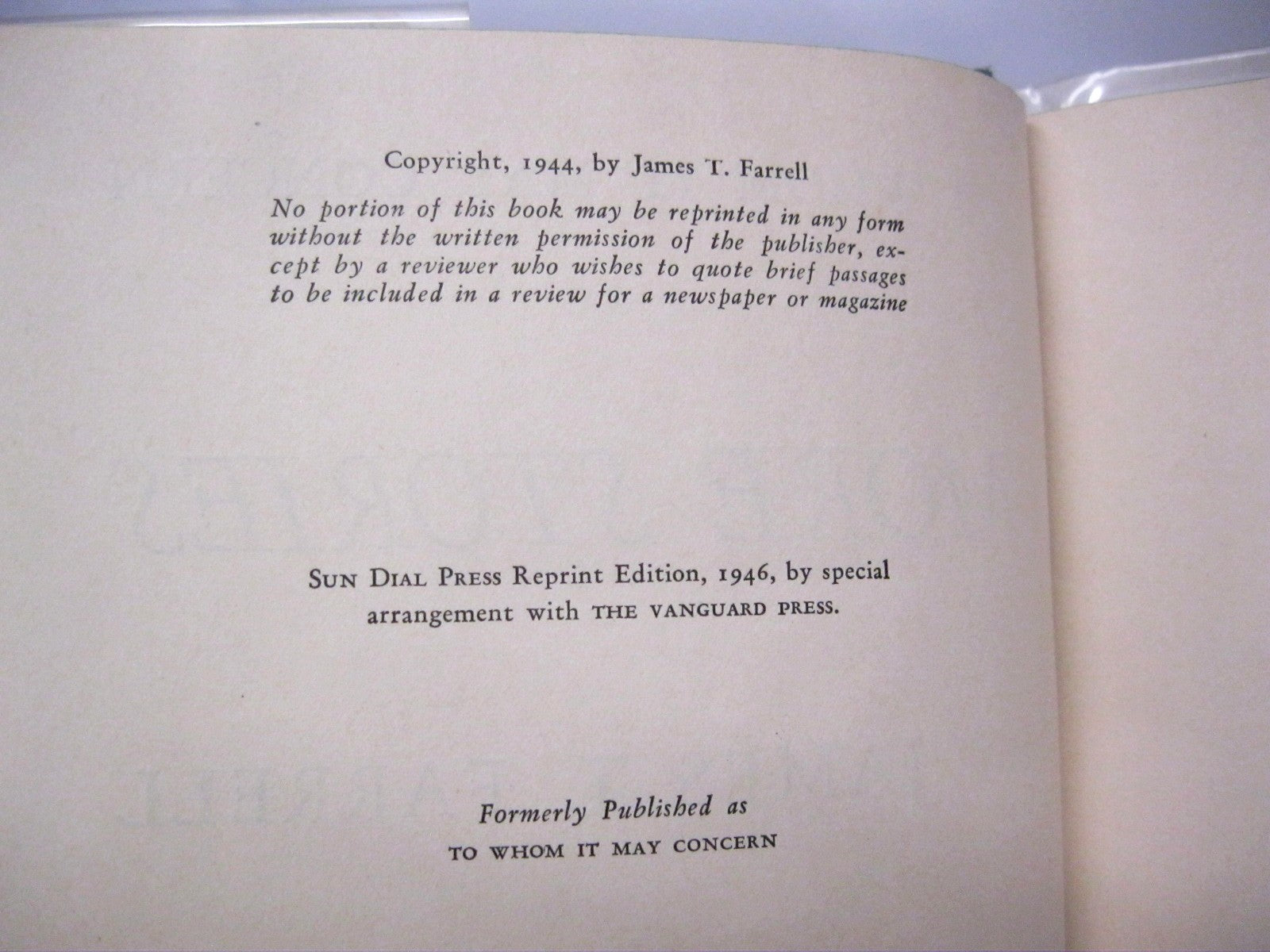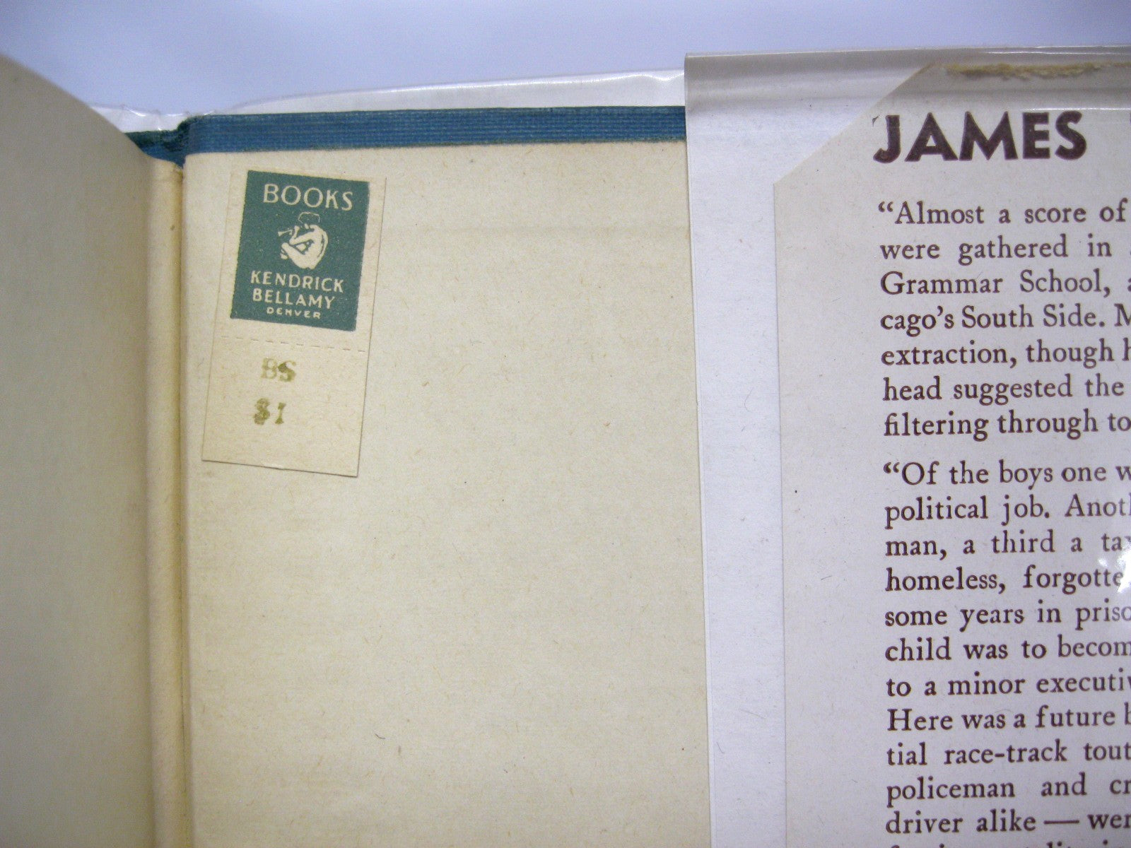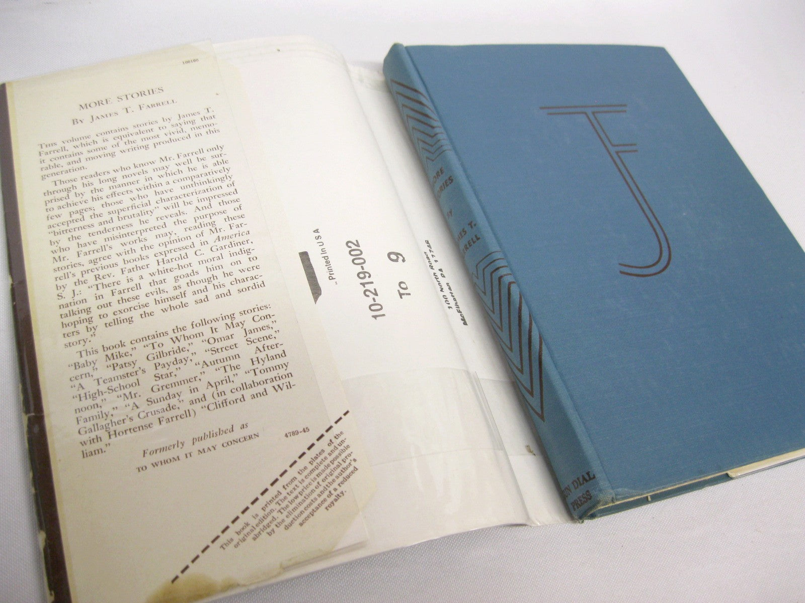 SIGNED and inscribed by Farrell on ffep: "To Mae and Alan Swallow with cordial regards / Jim Farrell, June 27/51, Denver CO". Alan Swallow was an American poet and professor of English at the University of Denver, who was mentored by Robert Penn Warren, and had his own namesake publishing business.