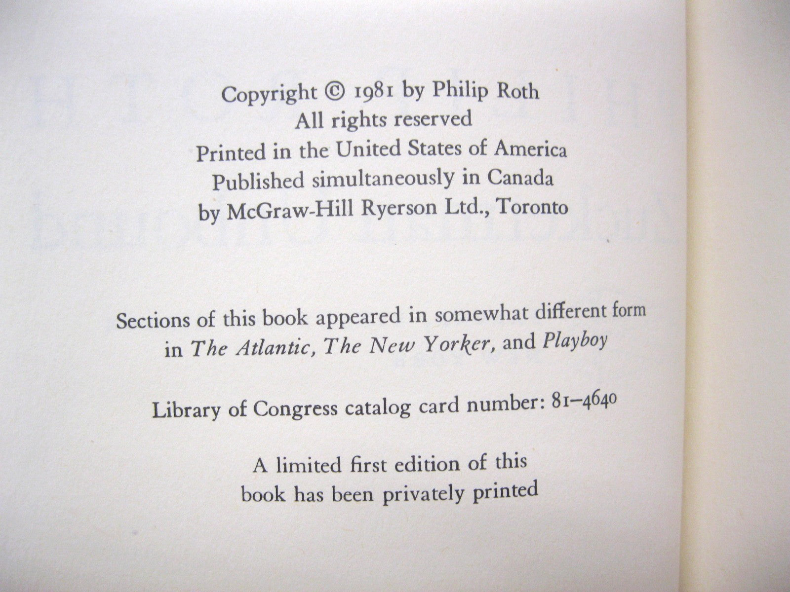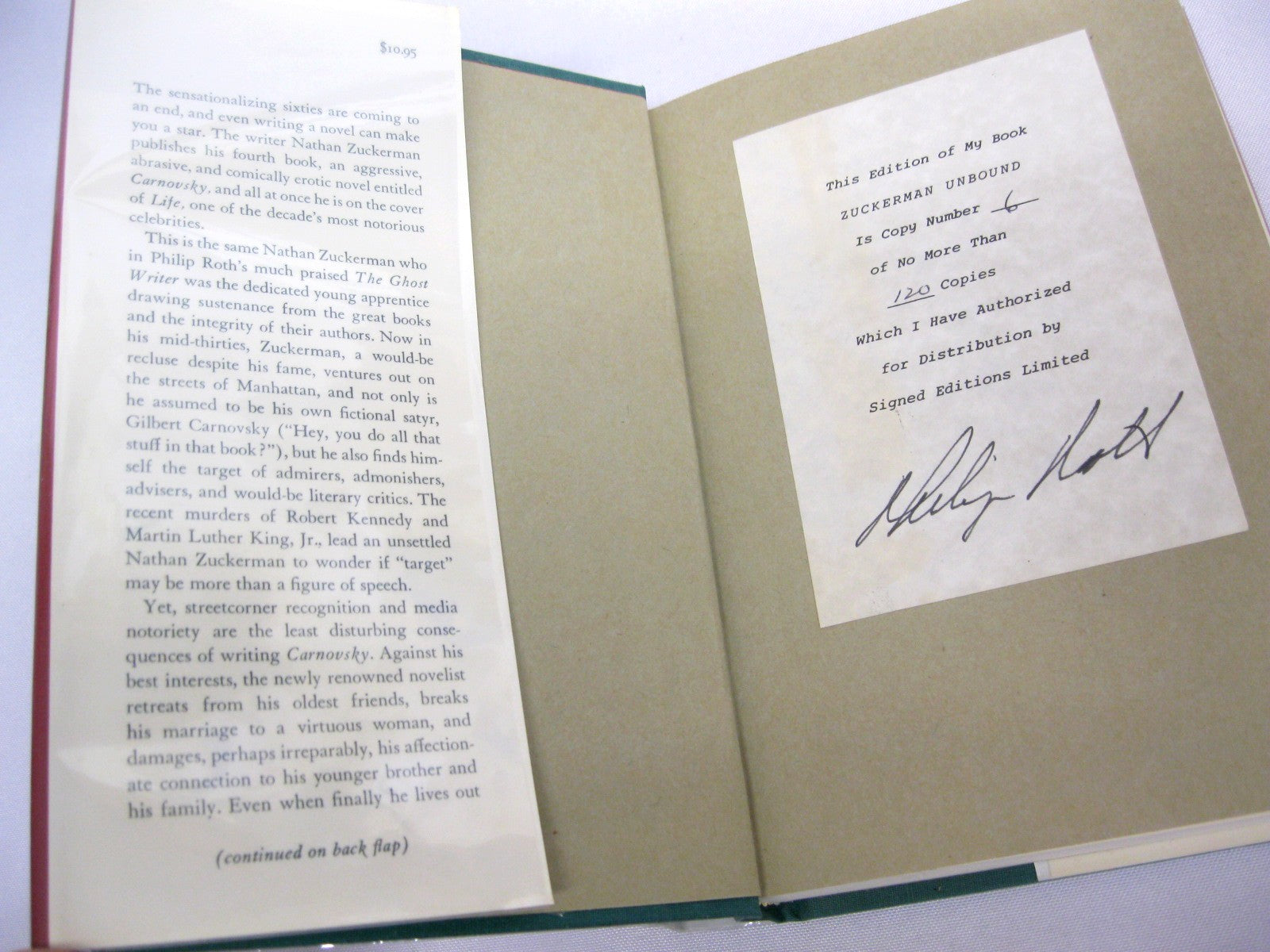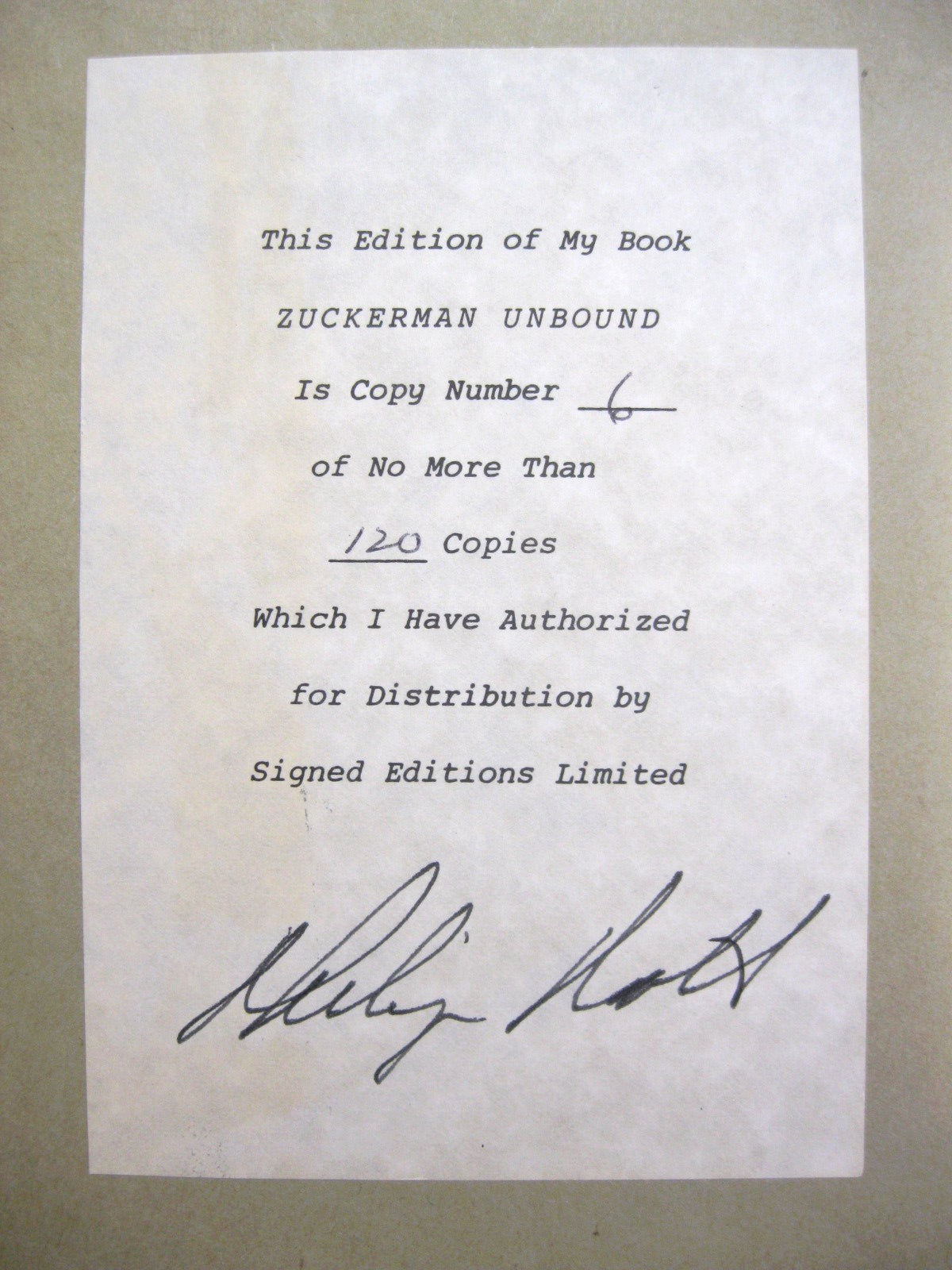 Signed by Philip Roth on a plate on the ffep, stating that this is #6 of 120 copies authorized for distribution by Signed Limited Editions.
